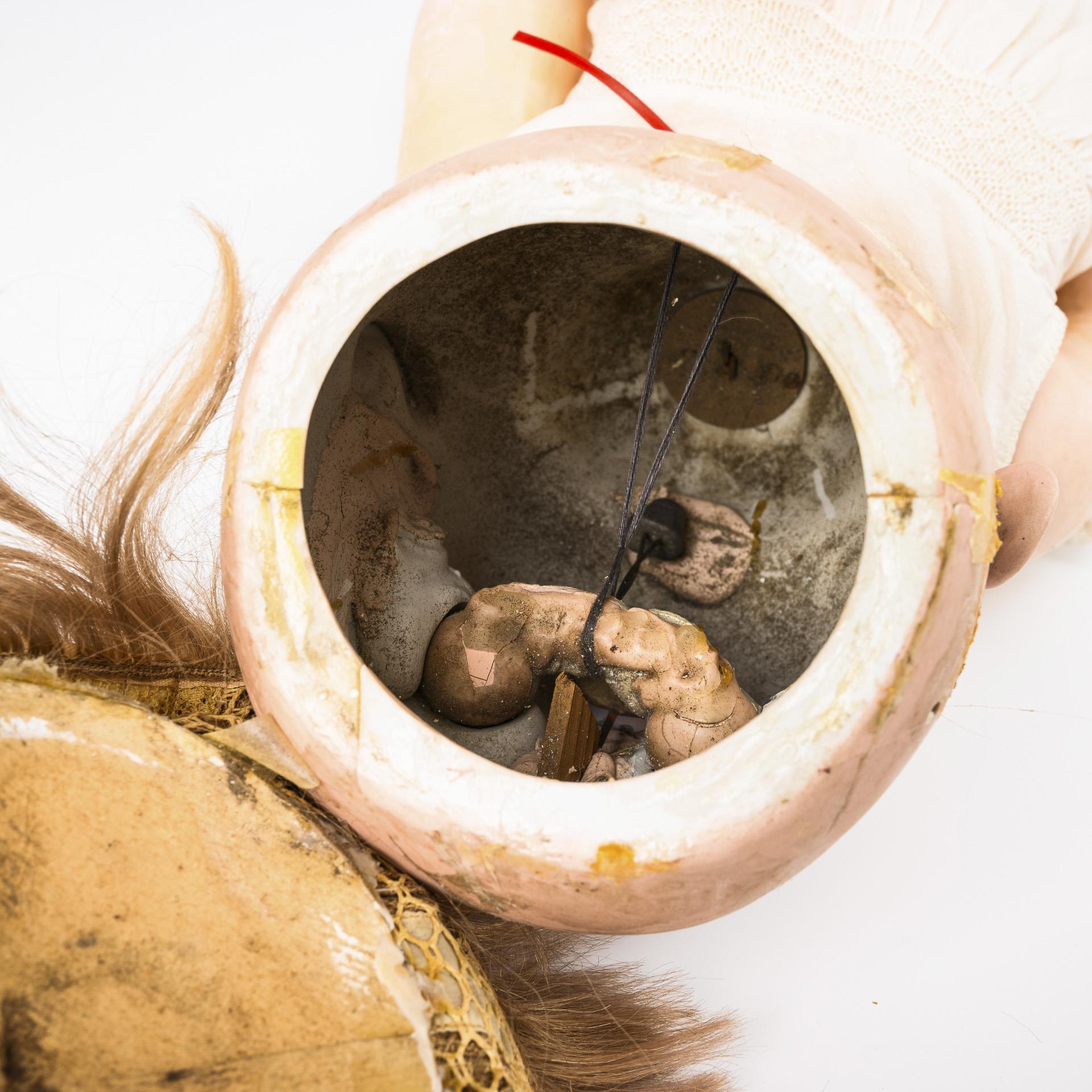 Cranked head, blue sleeping eyes, movable tongue, mohair bead with little teeth on the head. 5-part sitting baby body. Light-colored dress. Face glued together from several parts. Loose limbs, painted arms.