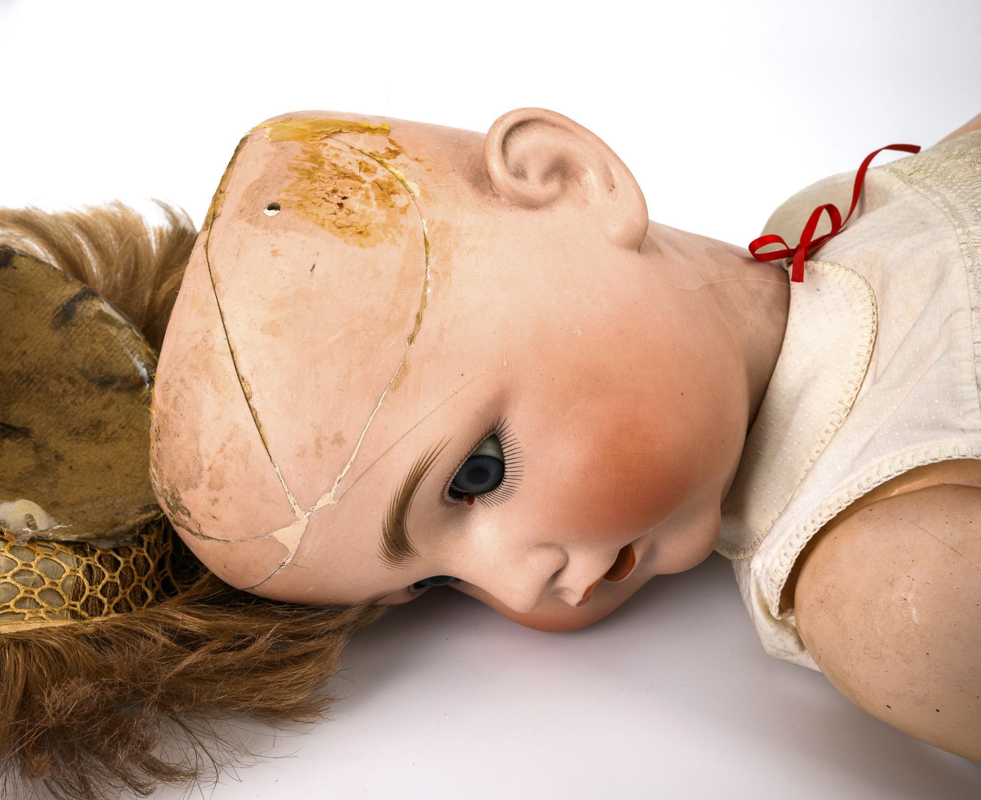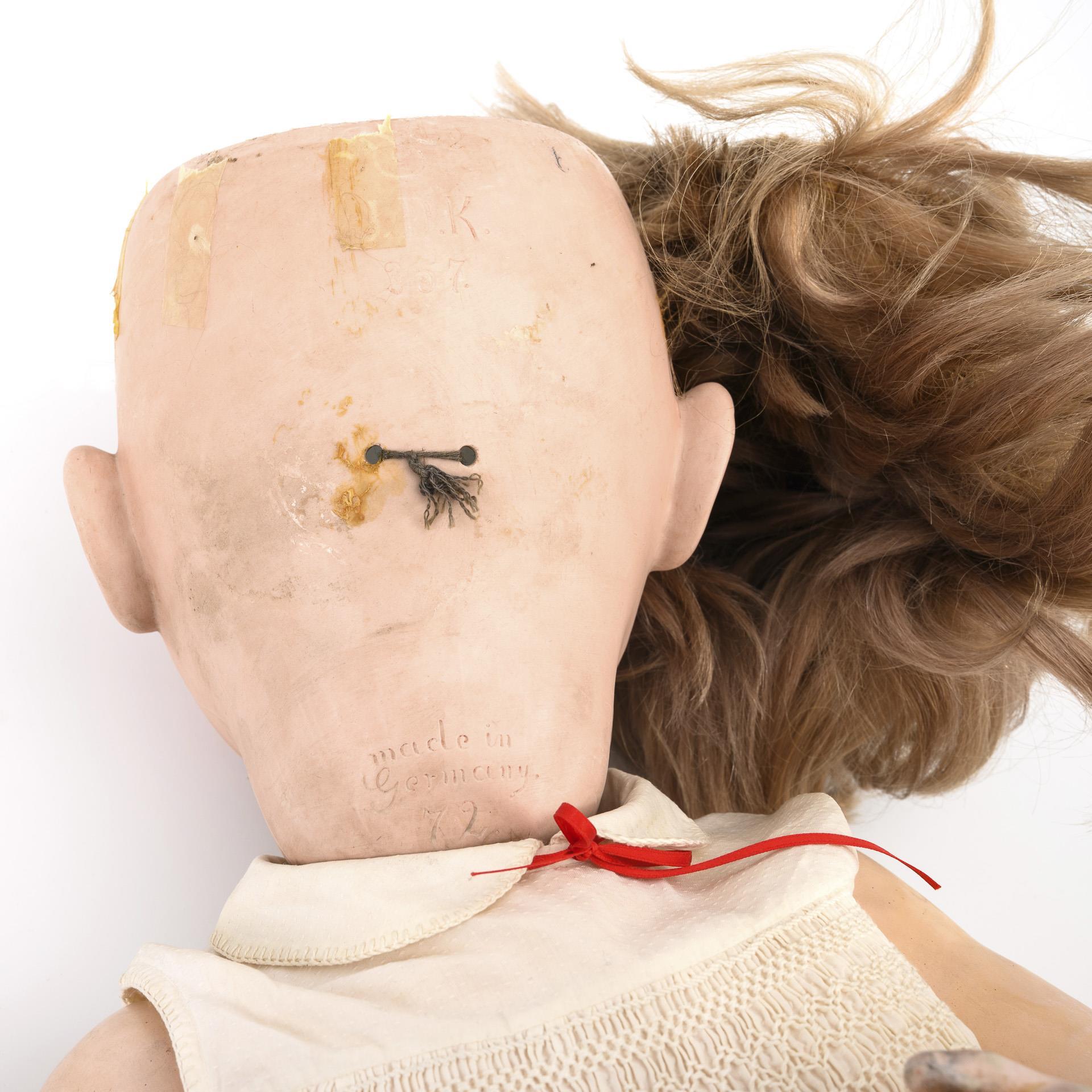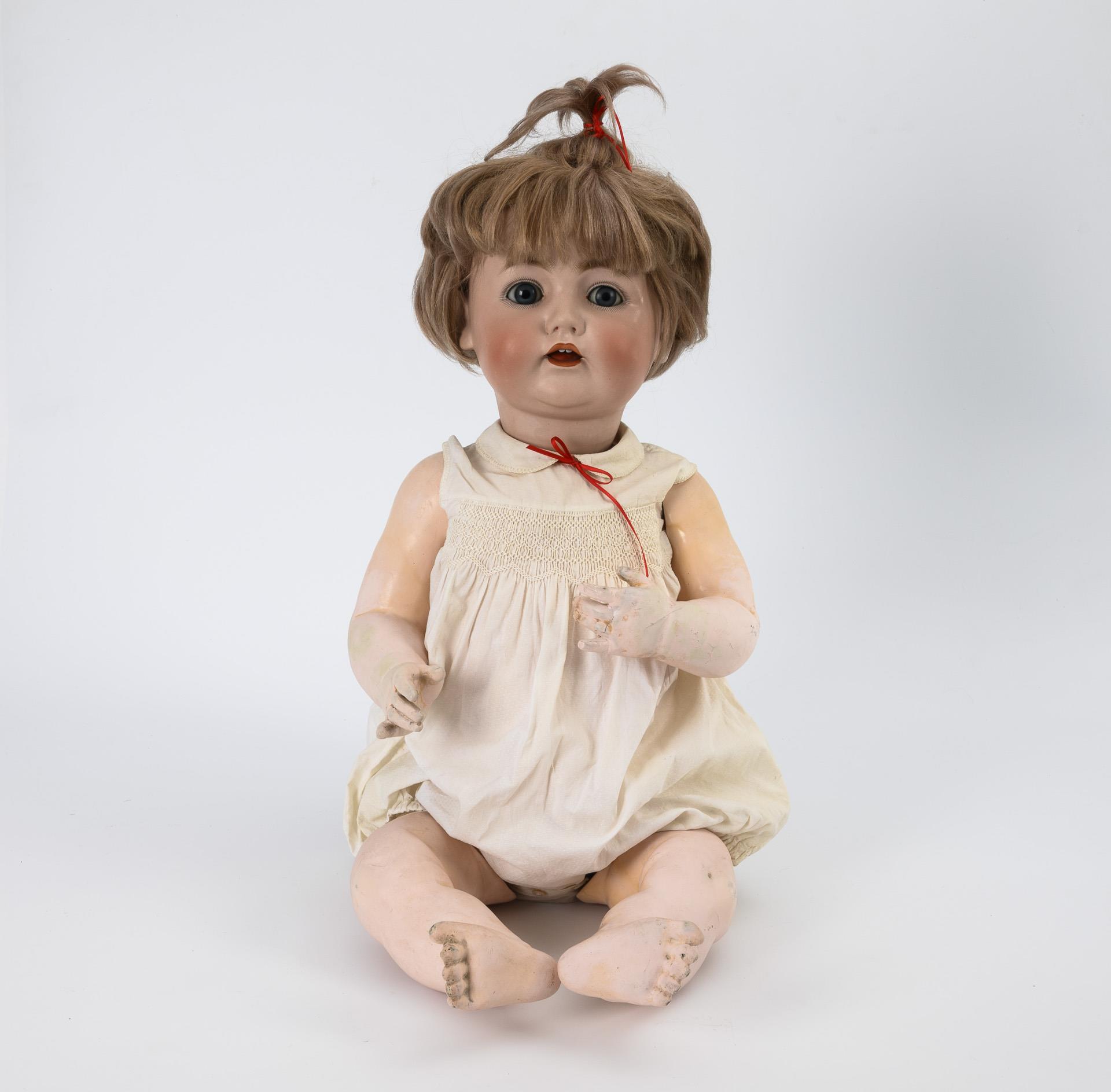 Cranked head, blue sleeping eyes, movable tongue, mohair bead with little teeth on the head. 5-part sitting baby body. Light-colored dress. Face glued together from several parts. Loose limbs, painted arms.