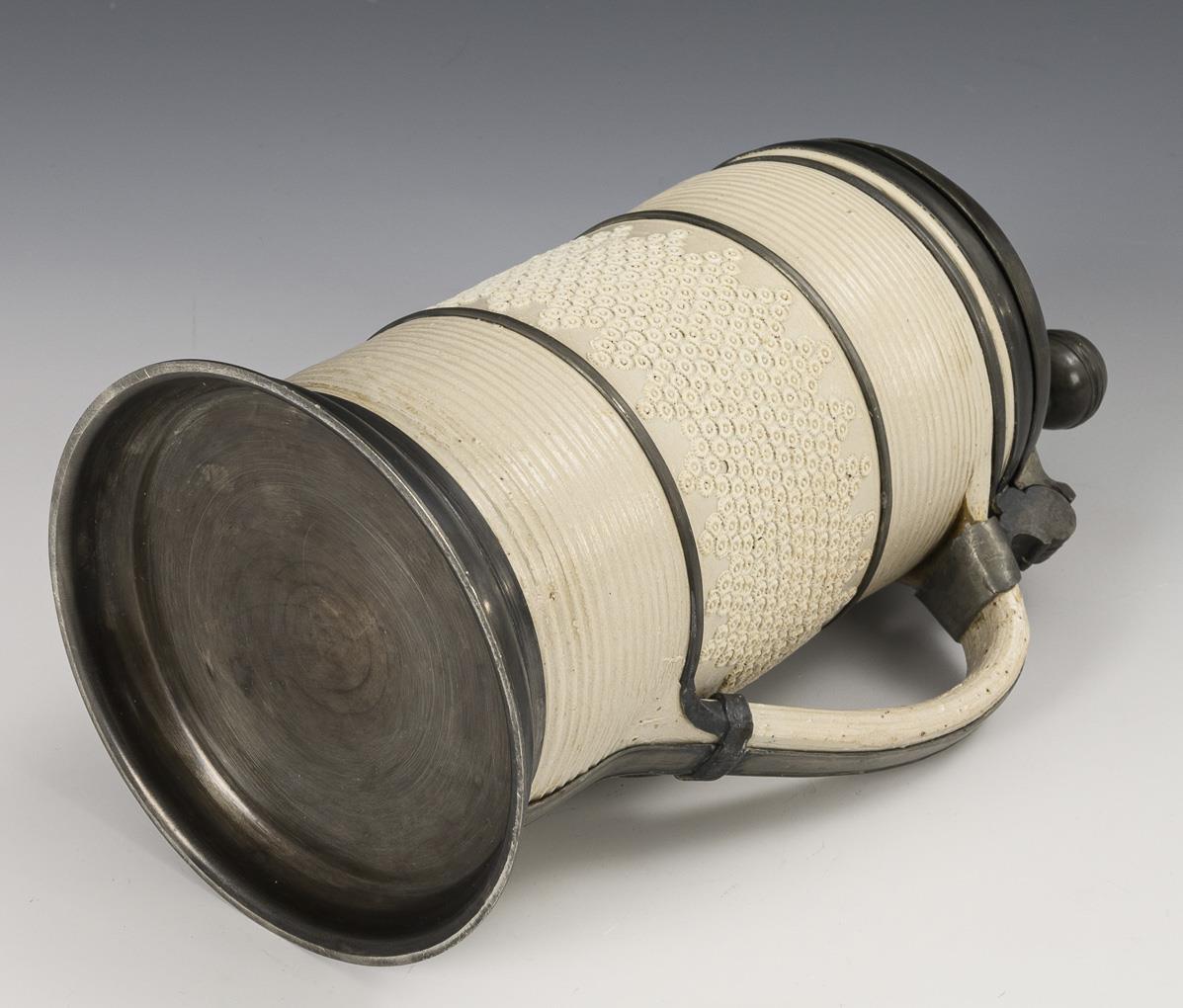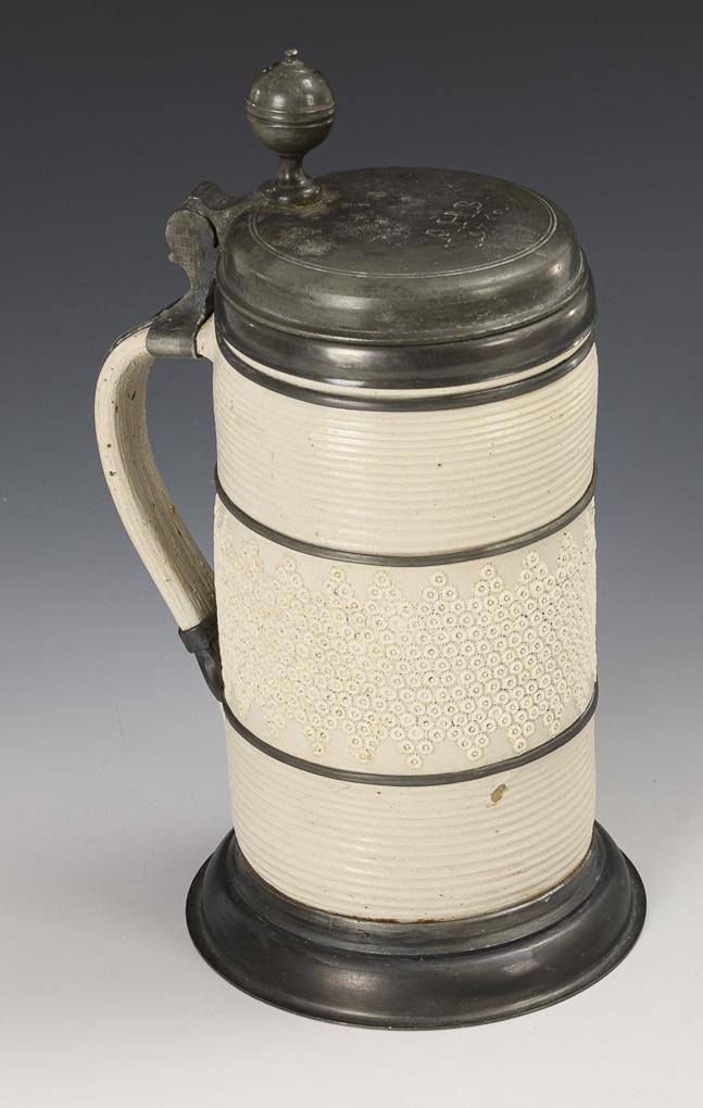 Cylindrical jug with strap handle, cross-groove and stamp decoration with surrounding rosette frieze. Pewter lid with spherical lid and engraving "AHB 1760", pewter straps, handle band and pewter stand. Haarriss on the base, partially minimally bumped.