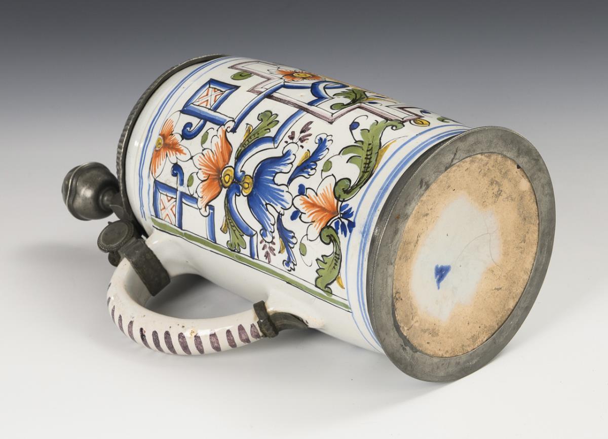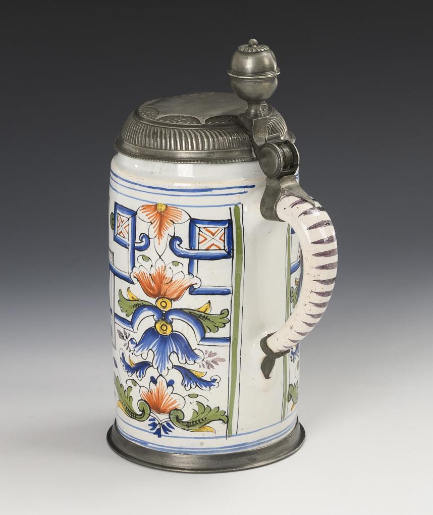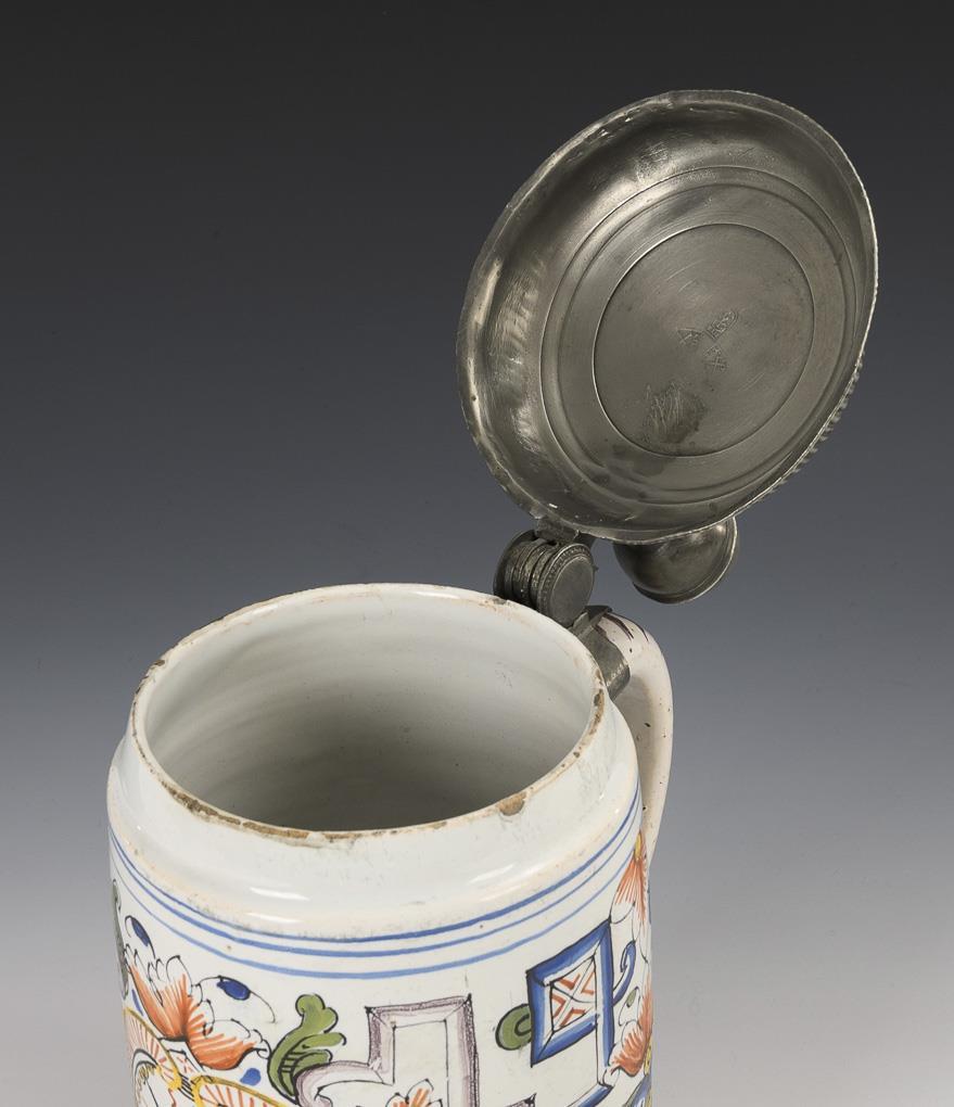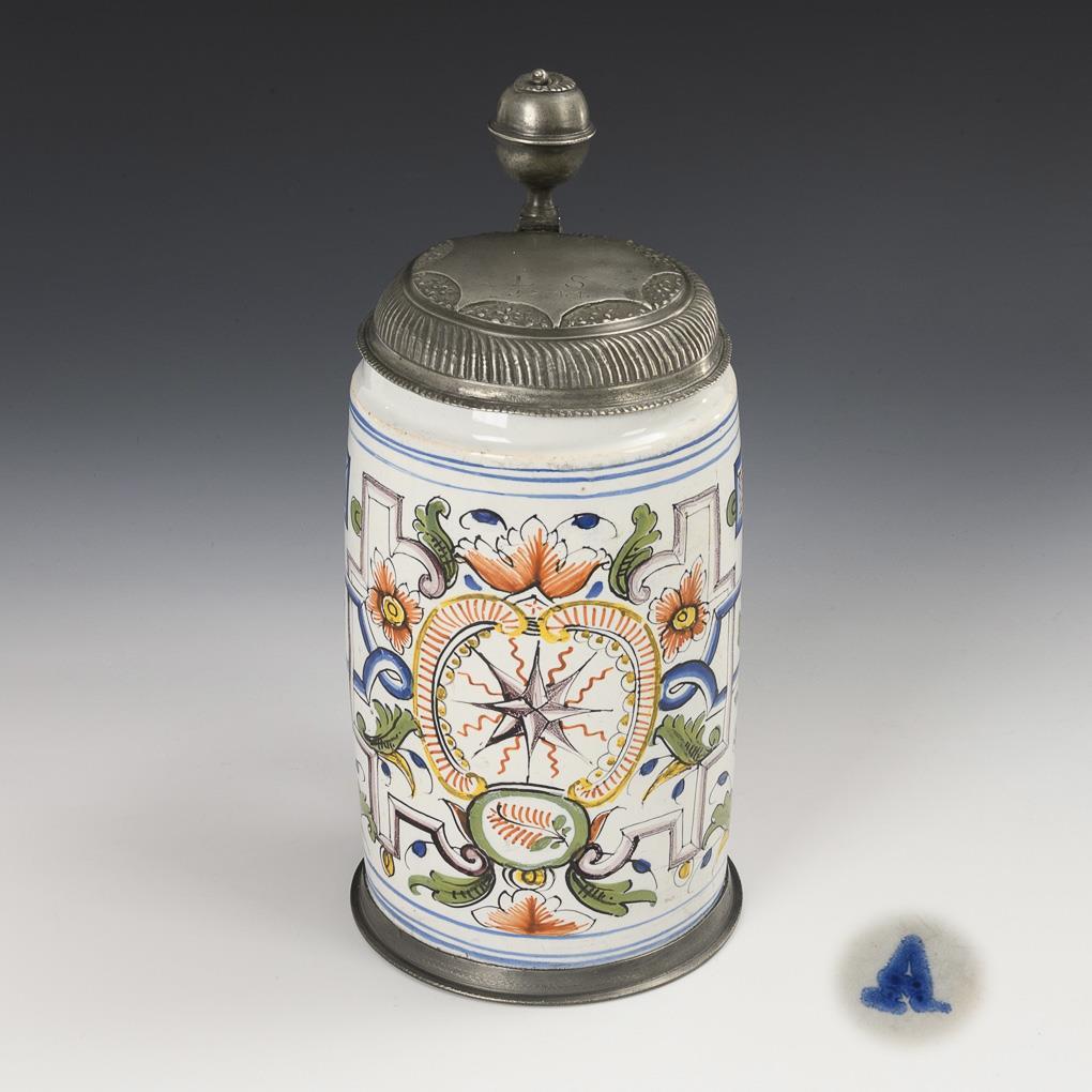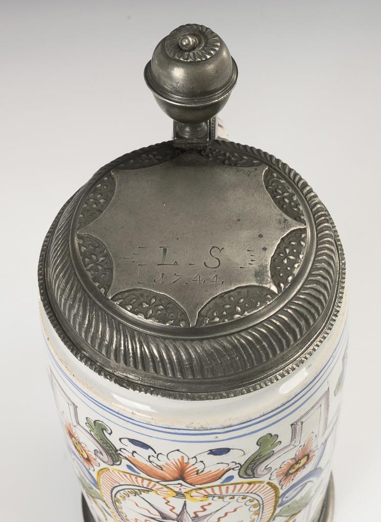 Cylindrical body with a ribbon handle decorated with lines, a rocaille reserve on the front with the rare motif of the Herrnhut star, flanked by scrollwork and flowers, floral pilasters on the sides. Replaced pewter lid with ball finial, engraved "L.S. 1744", hallmarked inside, replaced pewter stand ring. Finely cracked, slightly bumped and rubbed in places.