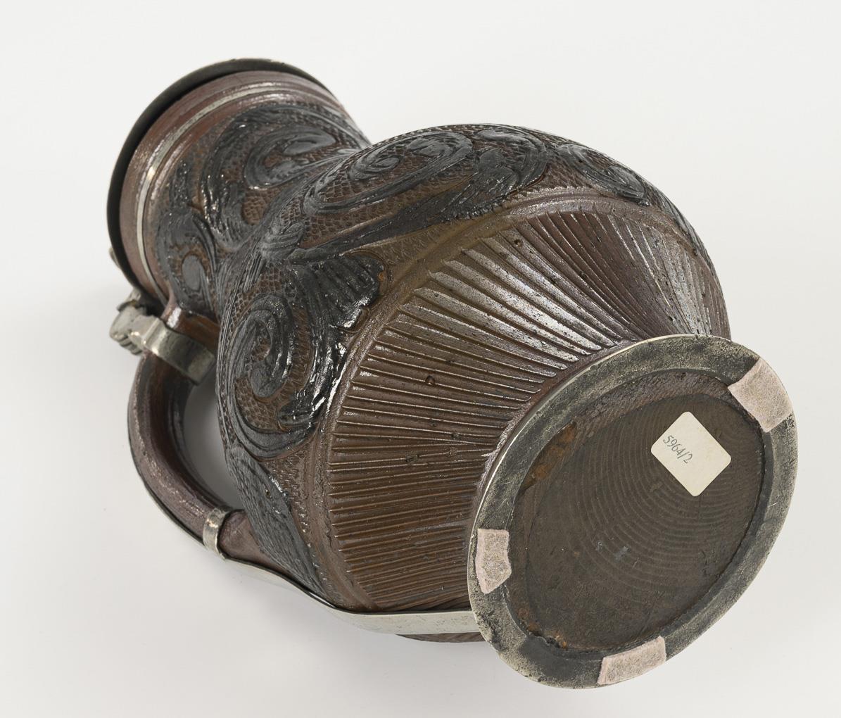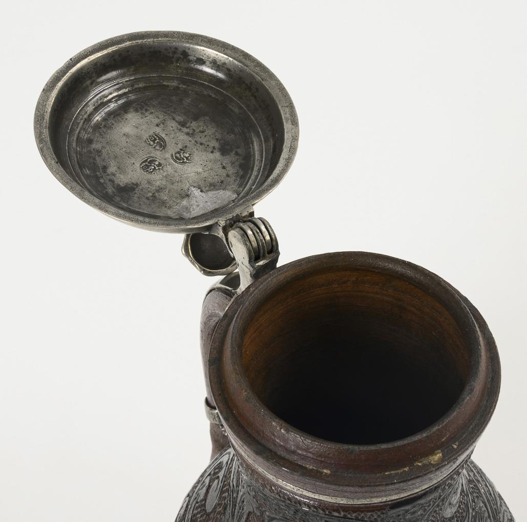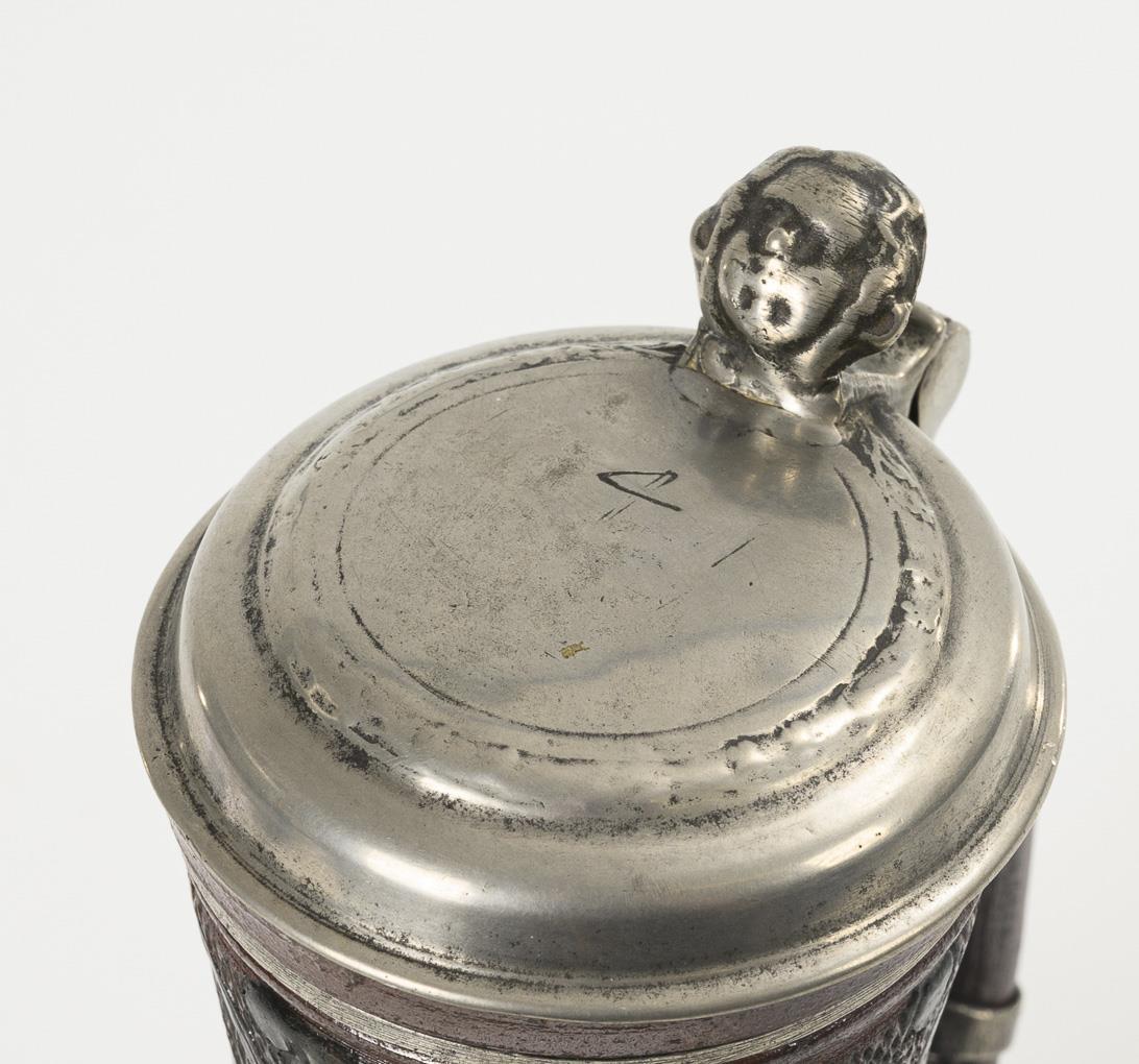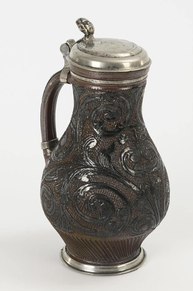 Slim-bellied shape with cylindrical neck and ribbon handle. Wall with vertical network, incised and cross-worked flowers and scrolled foliage, diagonally hatched drain. Pewter lid with angel's head finial, pewter hoop, handle with pewter band, pewter stand ring, punched inside. Mouth with fine crack, pewter with signs of use.