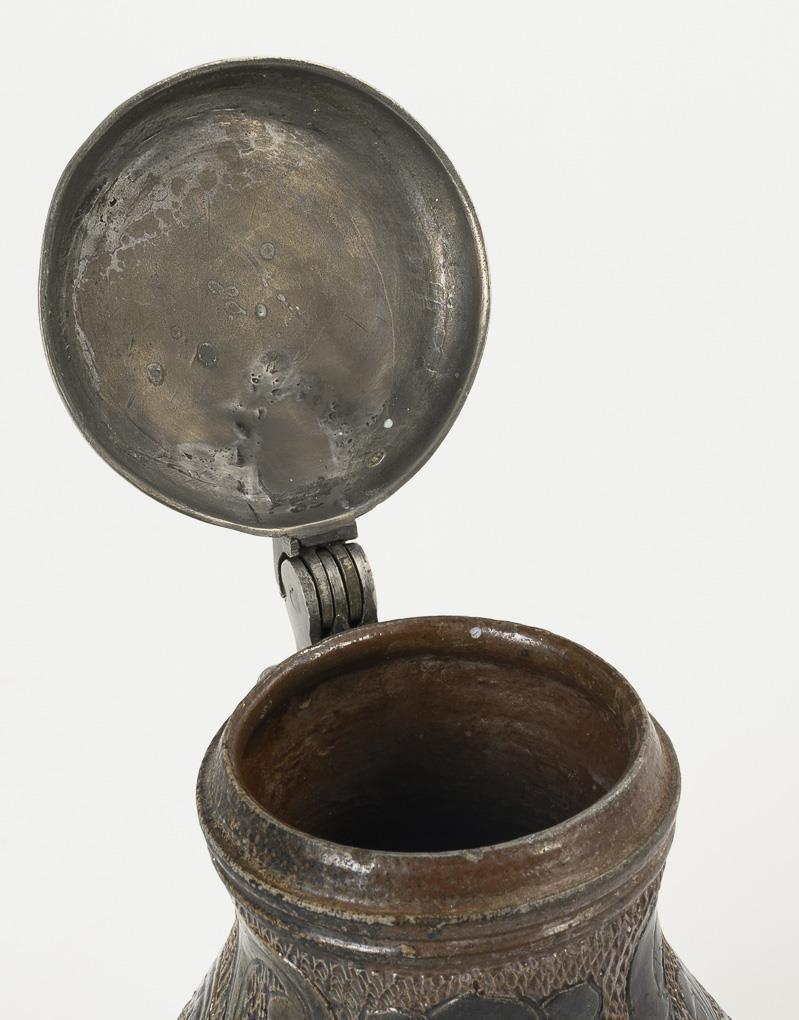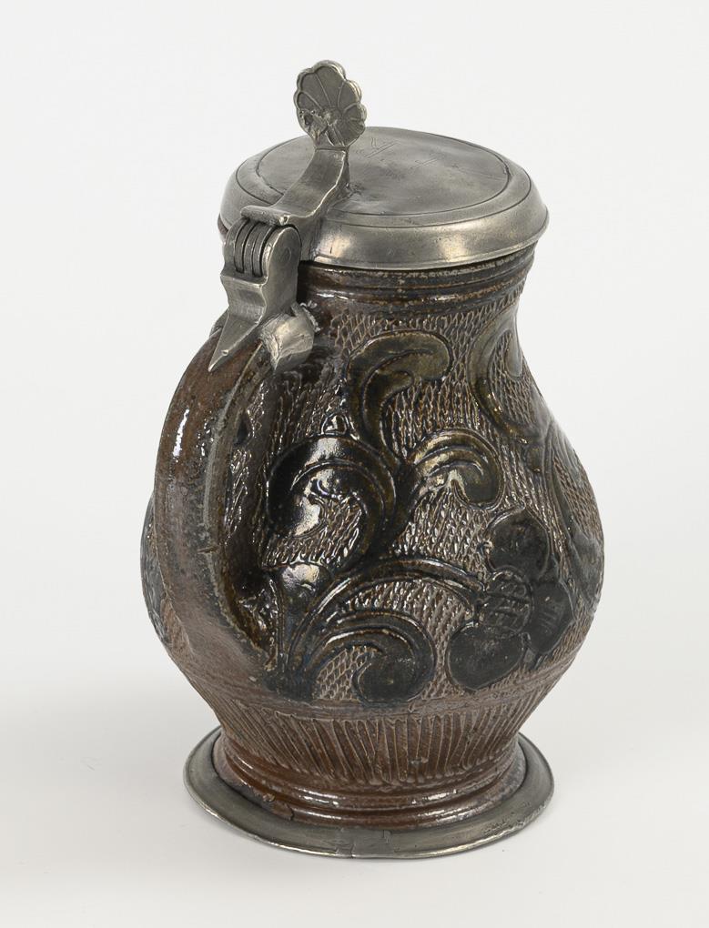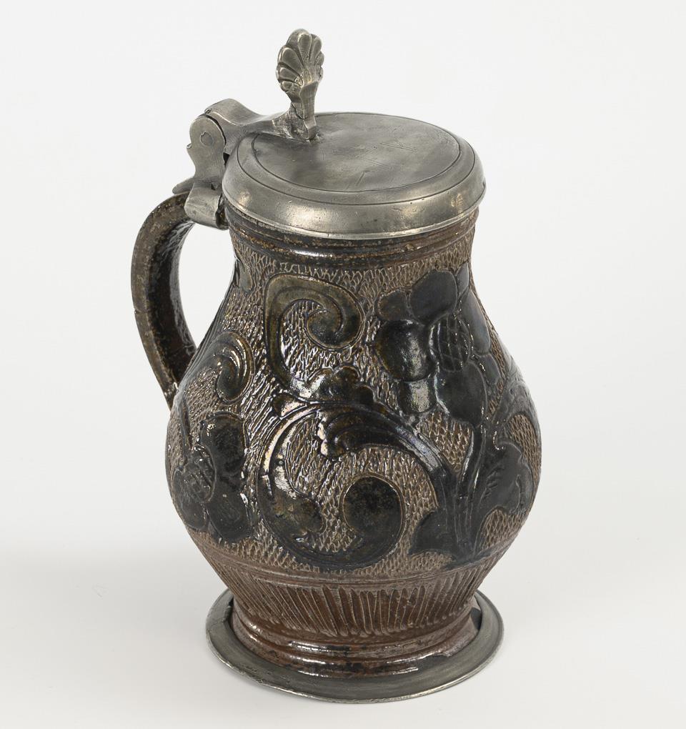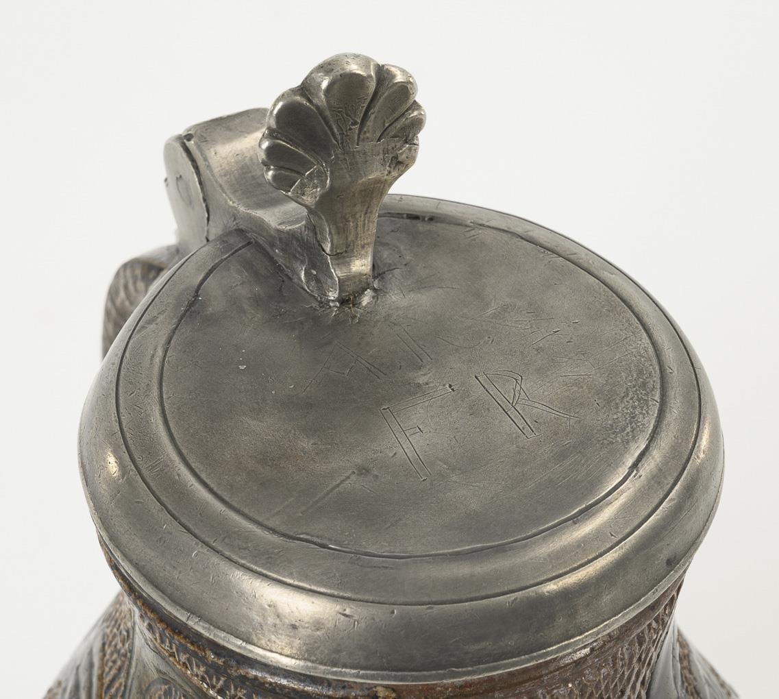 Thickened, bulbous shape with ribbon handle. Wall with incised flowers and scrolled foliage on a base with notched network, drain diagonally hatched. Flat pewter lid with shell-shaped lid, incised "AR" and "FR", pewter stand ring. Bumped at the base.
