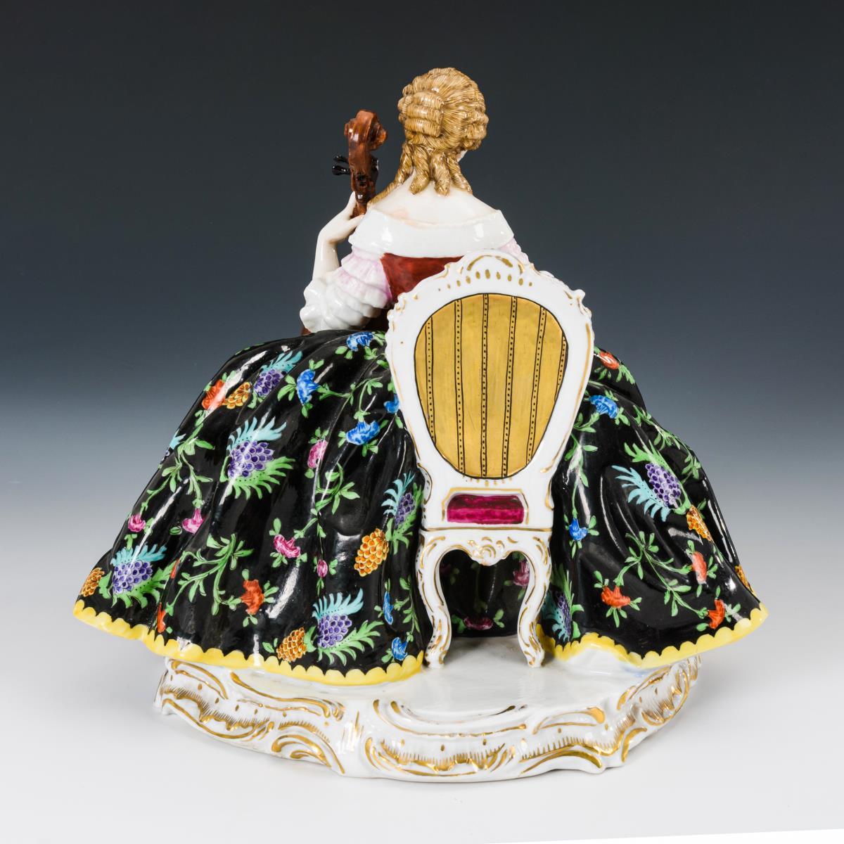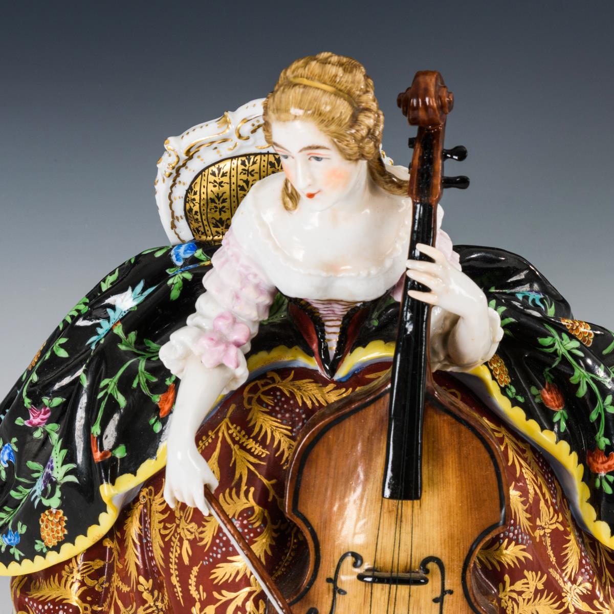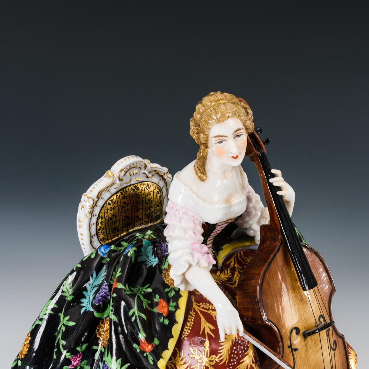 Sitzende, ein Cello spielende Reifrockdame. Bogen lose anbei, Griffbrett und Steg des Cellos restauriert.