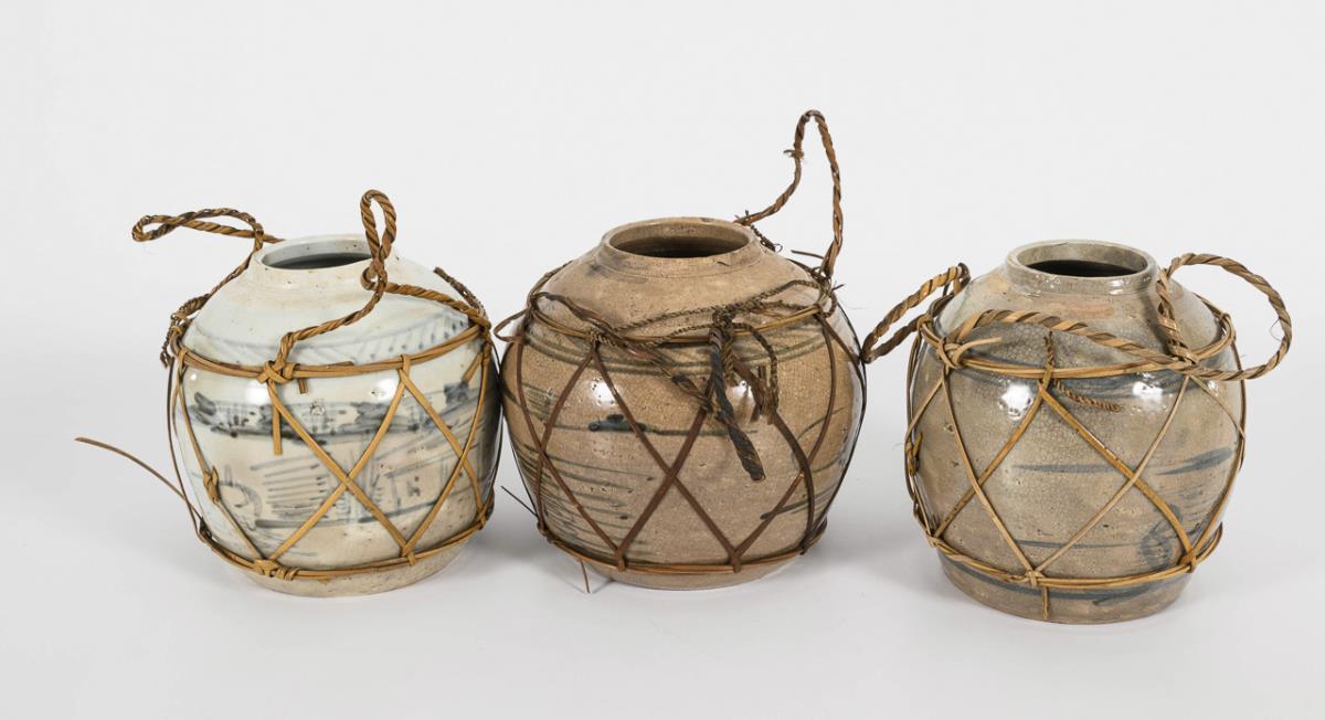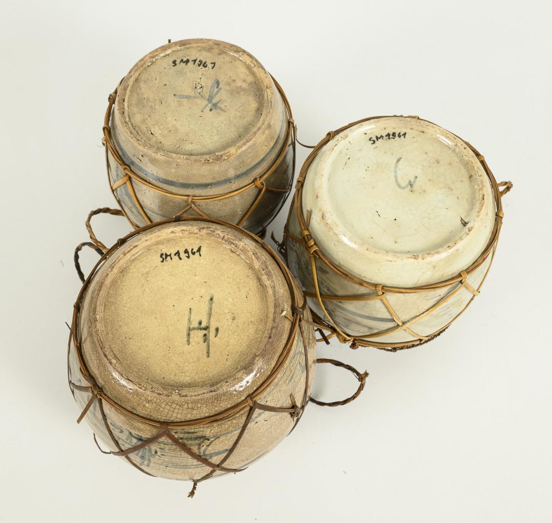 One light and two darker glazed pots with stylized water landscapes. Bast wickerwork in order. One pot with two production-related glaze defects.