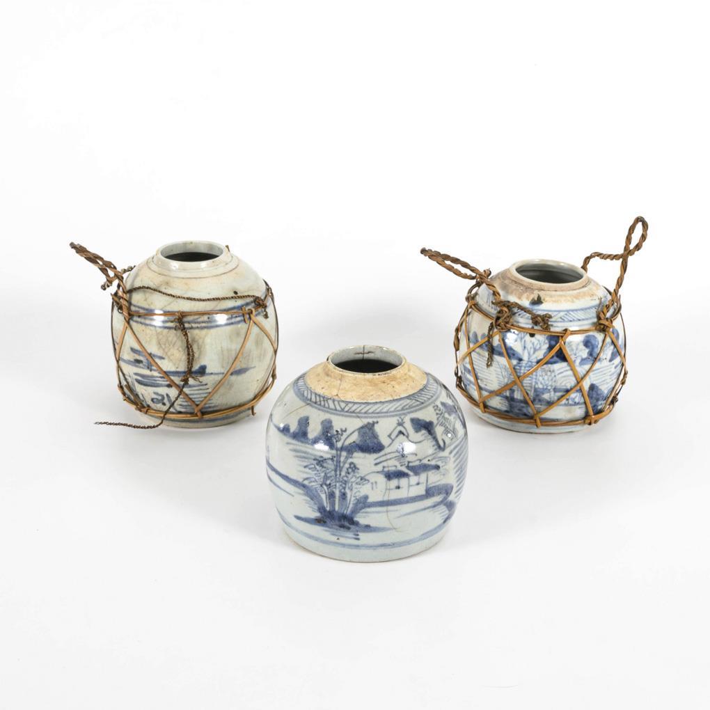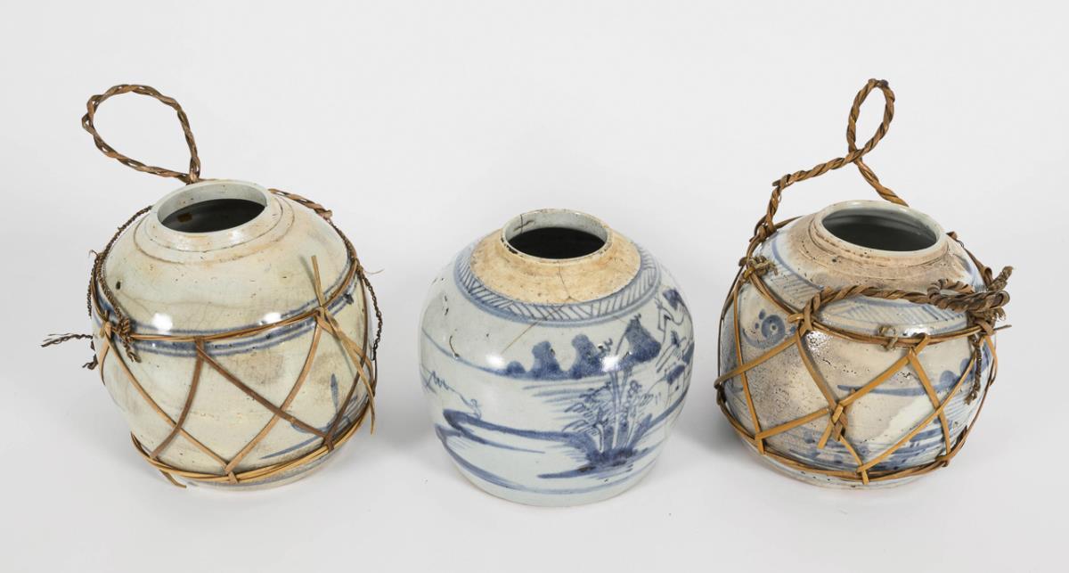 Pots with stylized landscapes from various workshops. One in strong blue, with complete raffia weave. Two other pots with hairline cracks and bast weave defective.