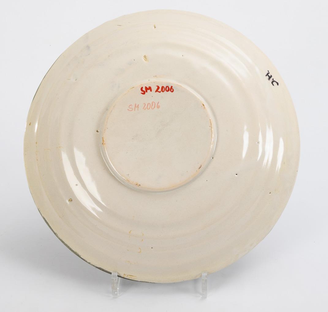 White glaze, painted in yellow, blue, green and manganese violet. Ø 33 cm.
