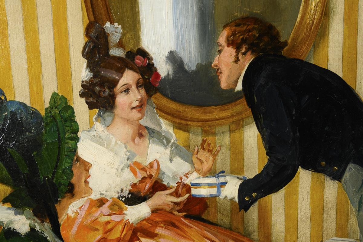 A young man presenting a gift to a young woman in a beautiful dress in the drawing room in front of a yellow and white striped wall. Slight traces of age.