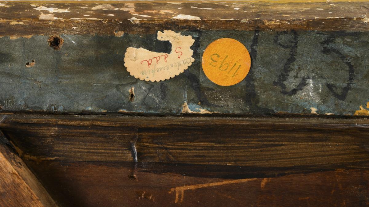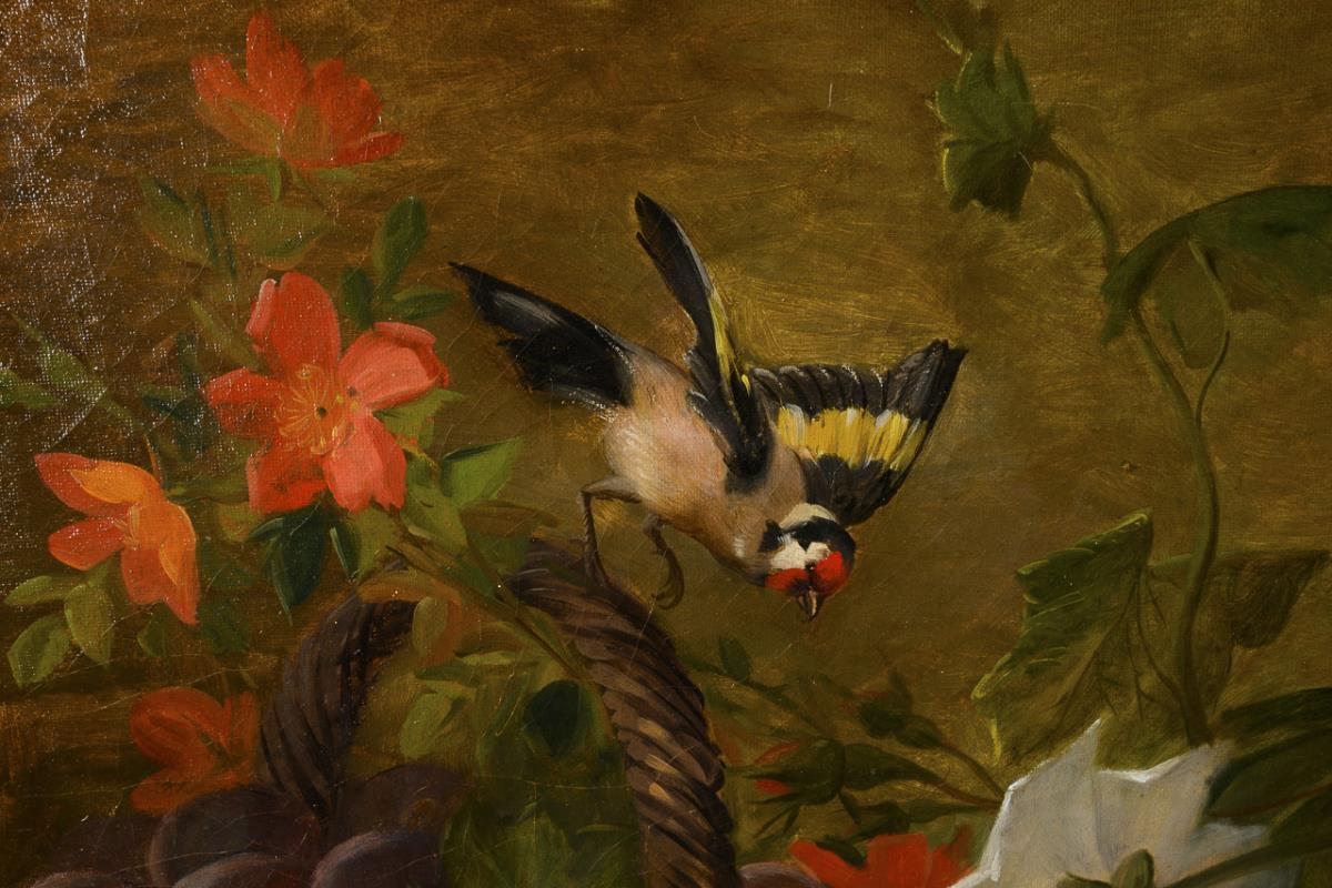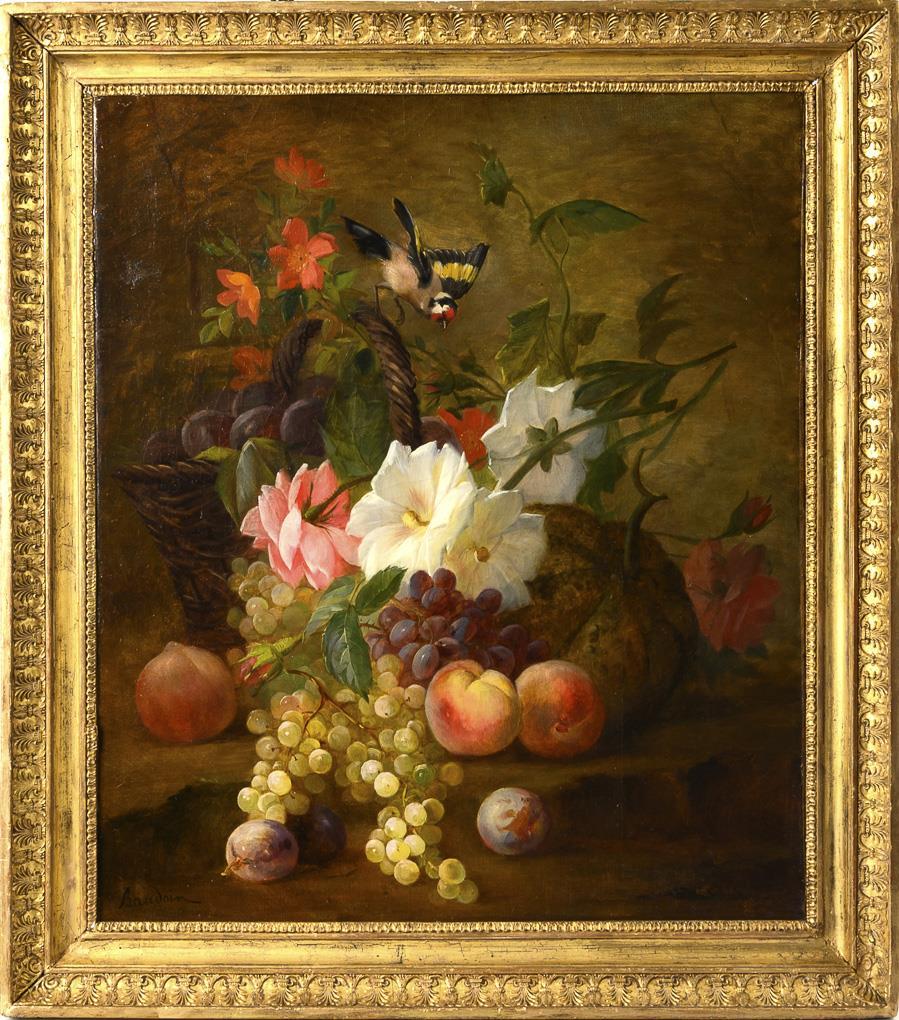 Harvest still life with grapes, peaches and plums next to flowers and a pumpkin as well as a goldfinch. Wax-doubled canvas.