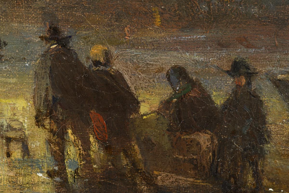 Evening mood with many people on the frozen river near the town with windmills. Doubled canvas.