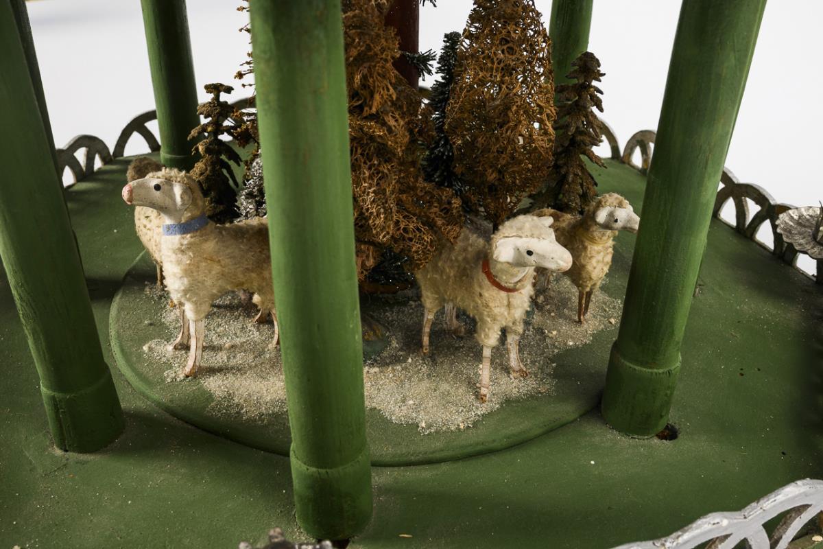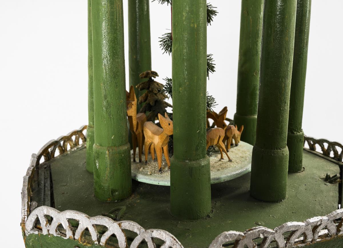 Christmas pyramid made of wood in green, silver and bordeaux with 11 removable wings made of dark red painted wood, decoration made of embossed cardboard in silver, three floors with figures: at the bottom 6 sheep in a snowy forest, in the middle St. Peter as conductor, followed by five angels playing music; at the top 5 deer. Minimal signs of use, function not tested.