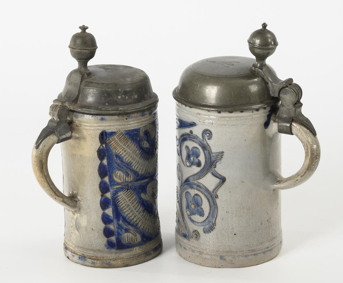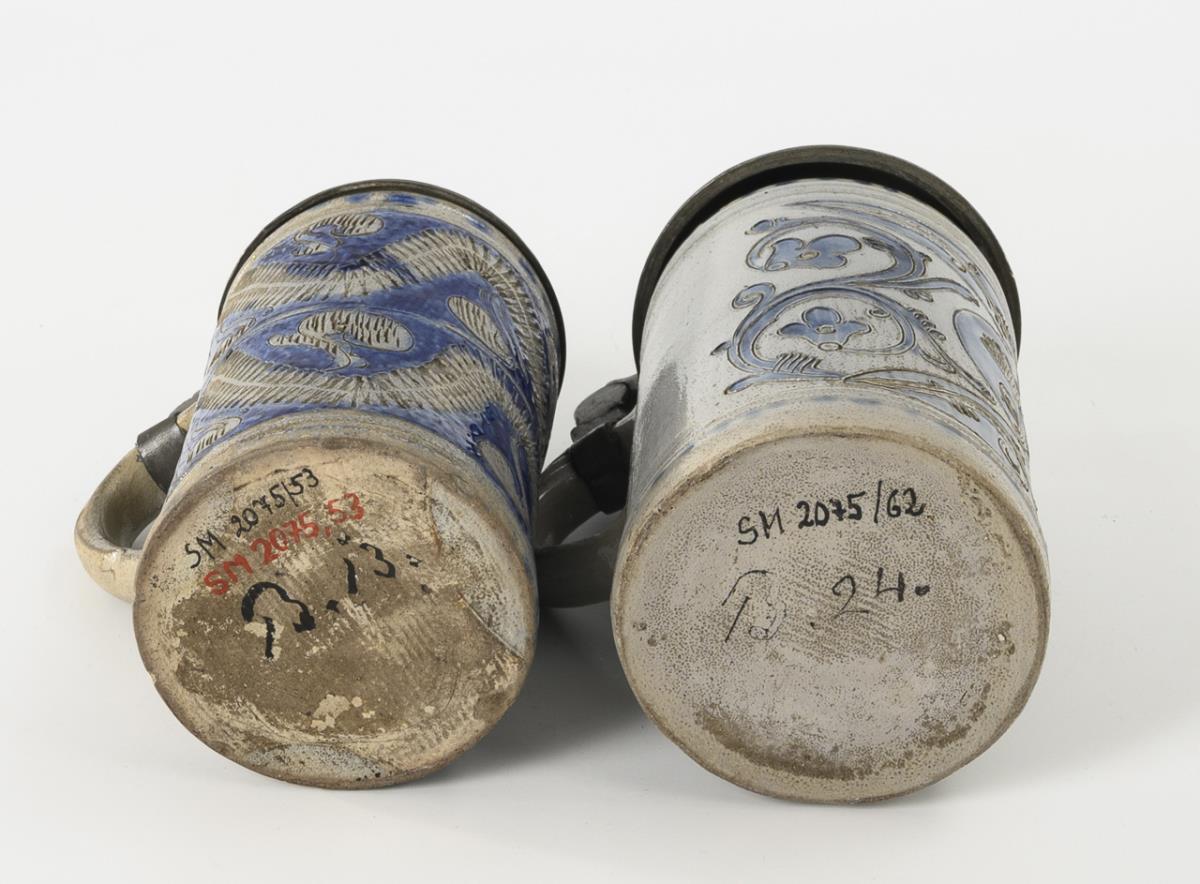 Grey, salt-glazed stoneware with incised and stamped decoration, cobalt blue painting and dotted decoration. H 21.5 and 22 cm.