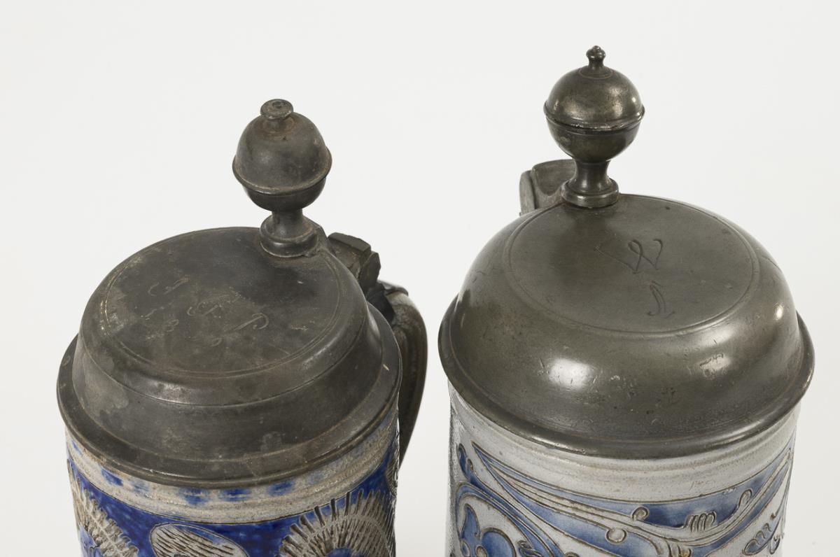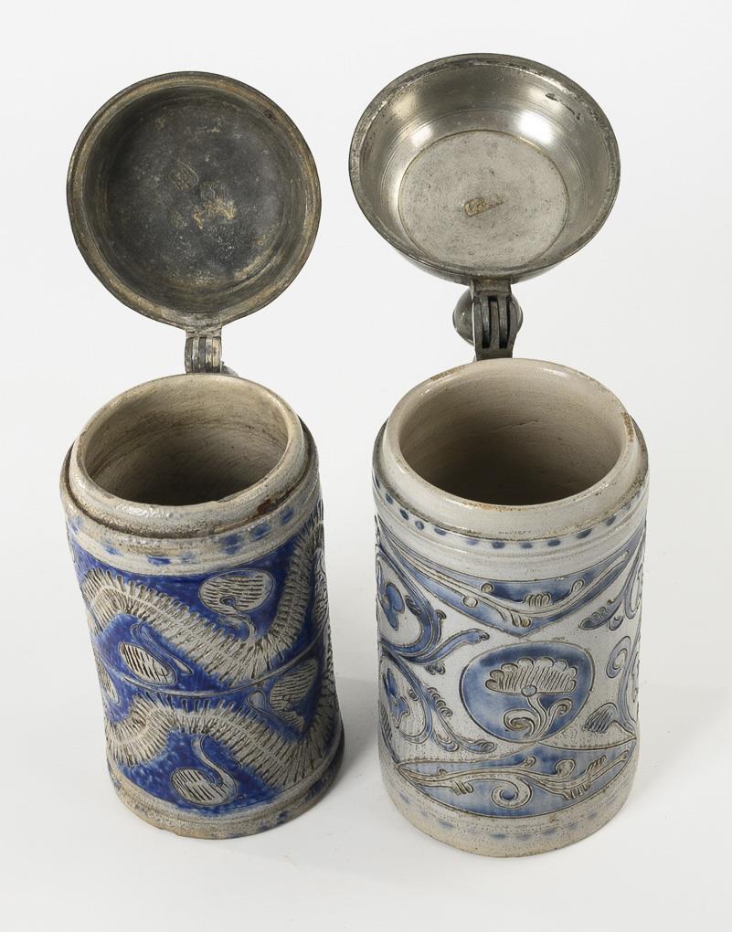 Cylinder jugs with tapered ear handles. 1x vine decoration with flowers, 1x double frieze with wavy bands in knibis technique. Each with engraved pewter lid and ball pusher, indistinctly hallmarked inside. Signs of age and wear, 1 lid replaced, 1 jug partially finely cracked.