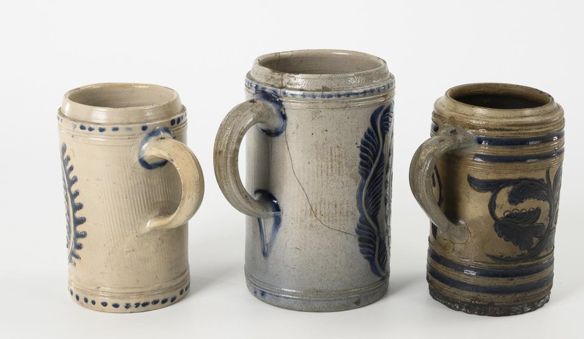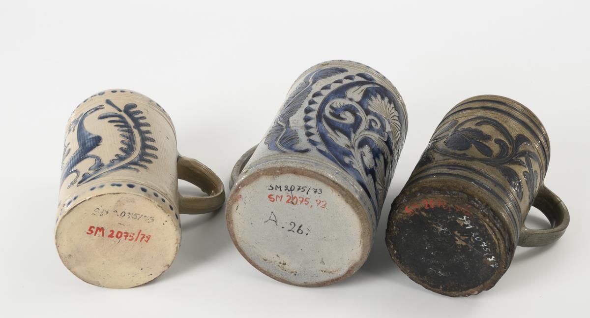 Grey, salt-glazed stoneware with incised and stamped decoration, cobalt blue painting and dotted decoration. H 16.5 to 19.5 cm.