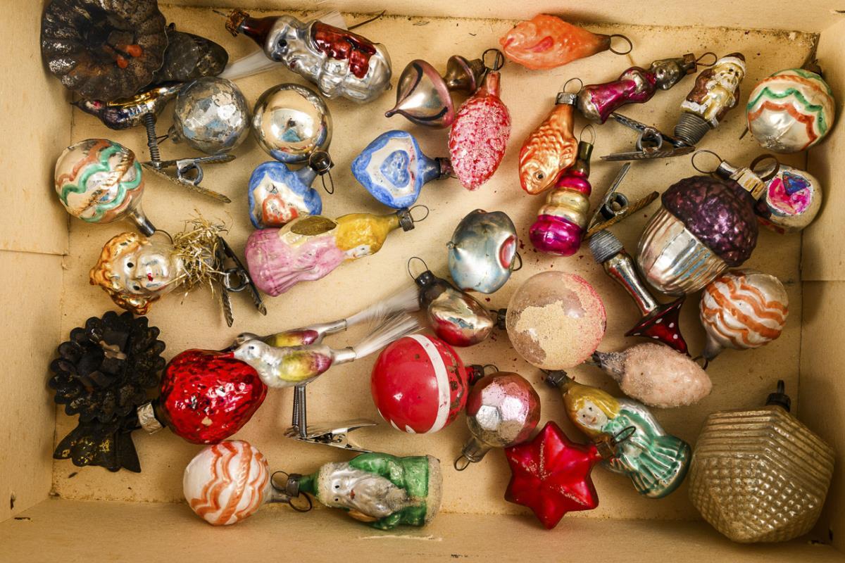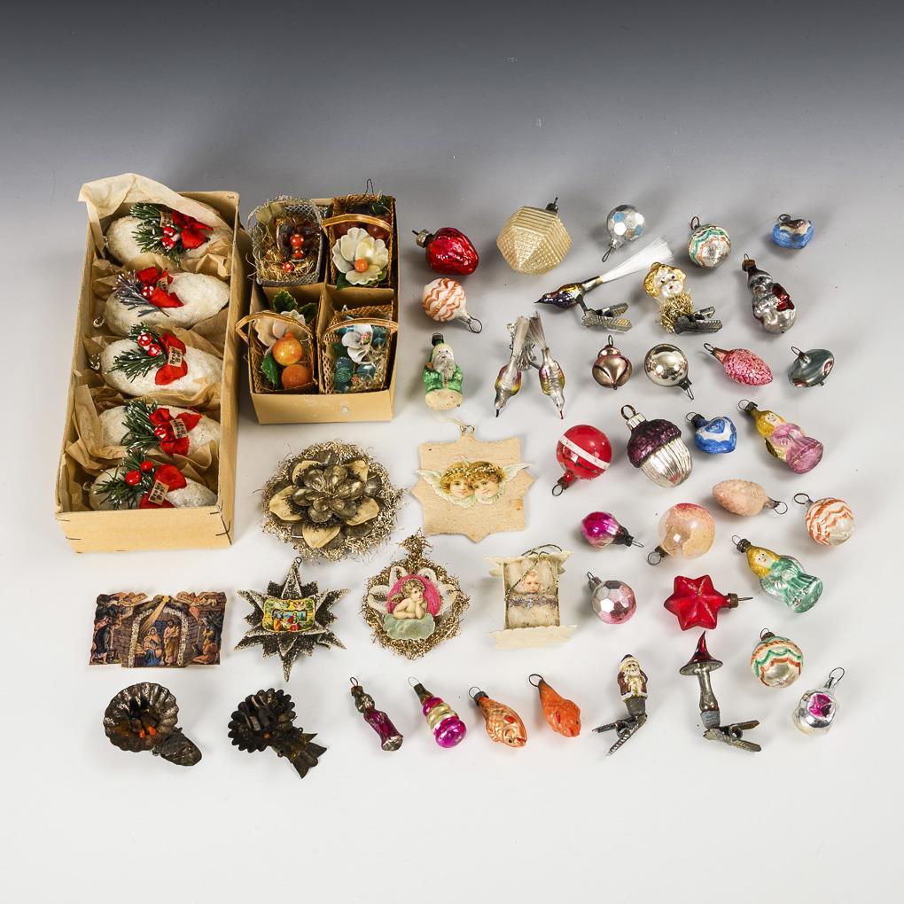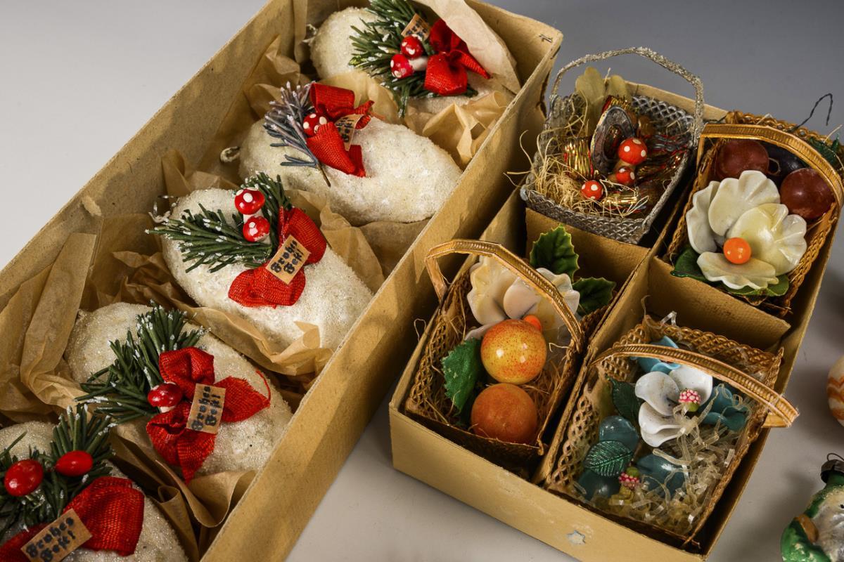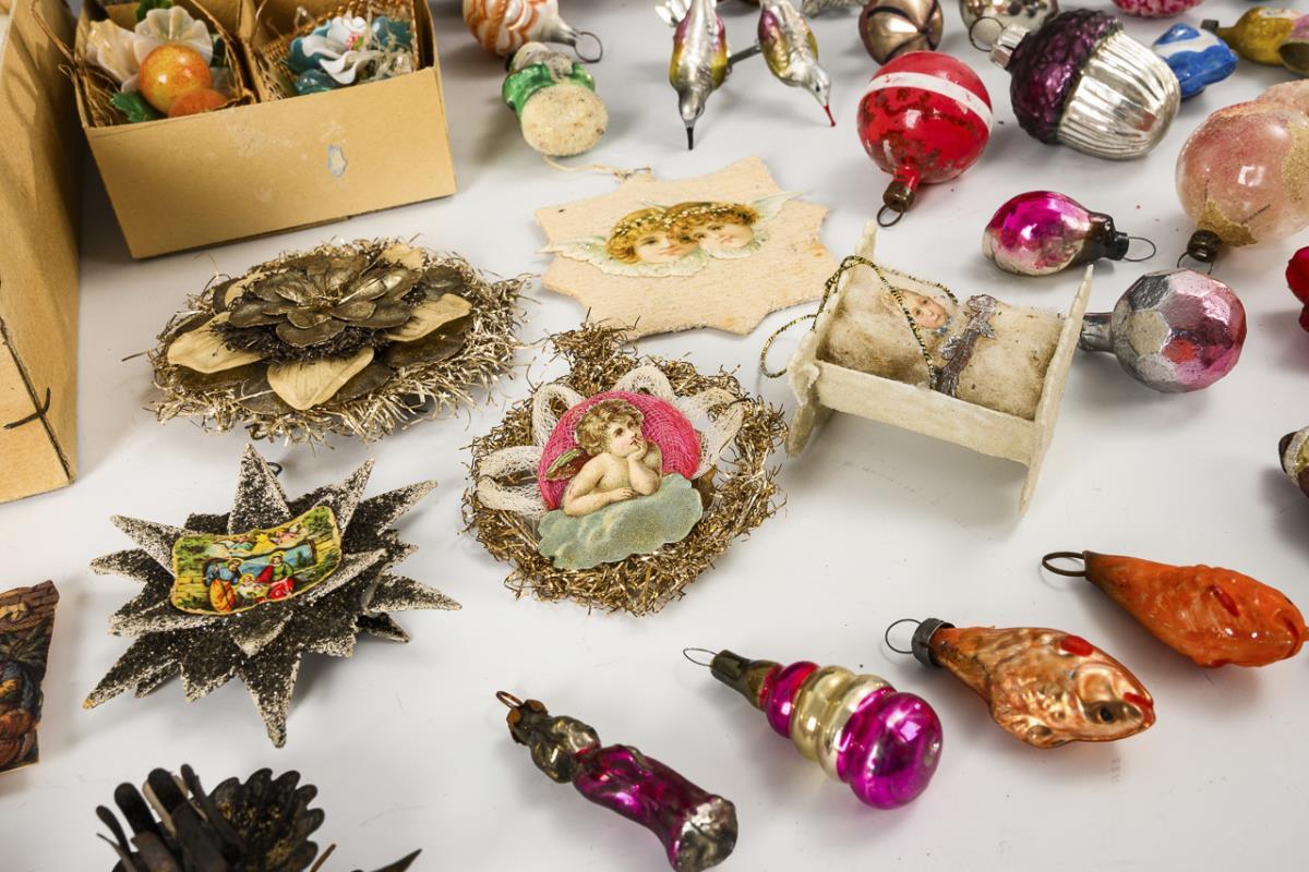 Various figurative glass decorations, 4 little baskets with handles, several cardboard pendants and 5 cones with snow gravel and cardboard inscription: "Fröhliche Weihnachten". Parts with defects.