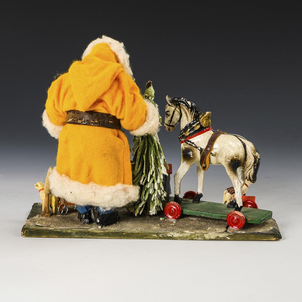 Mass Santa Claus in yellow coat, with little tree, horse on wheeled plate and some Erzgebirge animals on green wooden plate, 20 x 27 x 10 cm. / Round, pink candy box with cookie doll in absorbent cotton clothing on the lid, h 9.5 cm, Ø 7.5 cm. Some slight signs of age and wear.