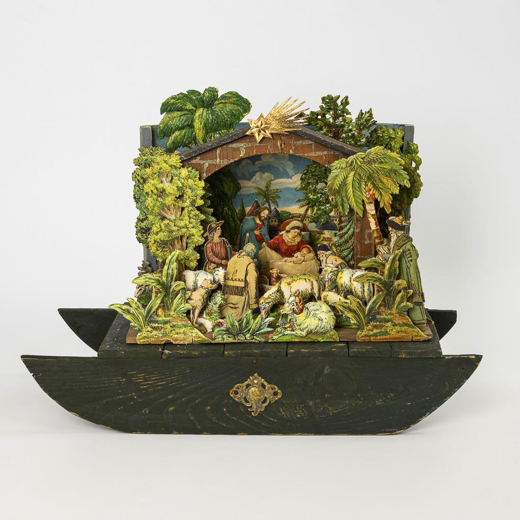 Wood, paper and cardboard, partly lithographed in color. Crib: 26.5 x 33.5 x 15 cm. Height together: 36.5 cm.