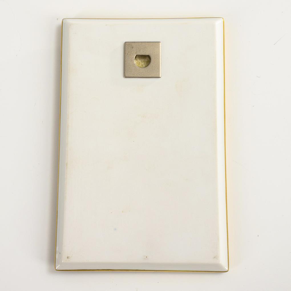 Rectangular plate with the relief depiction of the wolf with hat standing in front of a grandfather clock, the seven little geese grouped in and around the grandfather clock.