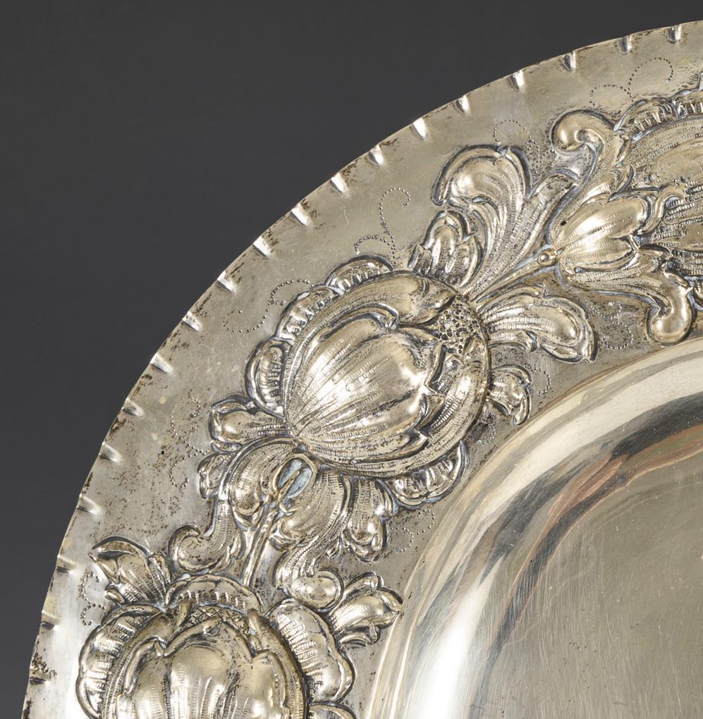 Oval silver plate with fruit motifs in rich relief on the wide rim. Multiple dents in the mirror, a few small cracks in the fruit decoration.