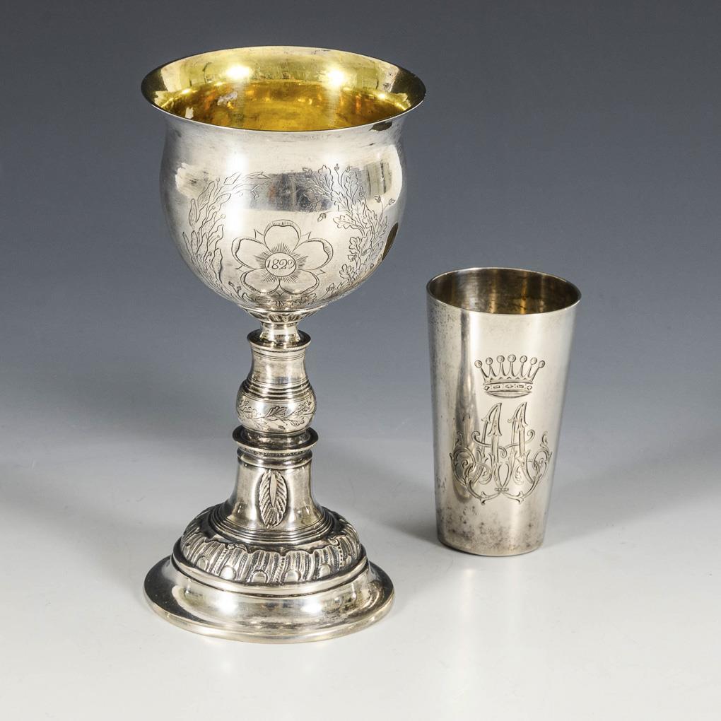 Silver Biedermeier goblet and conical silver cup.