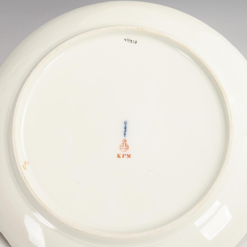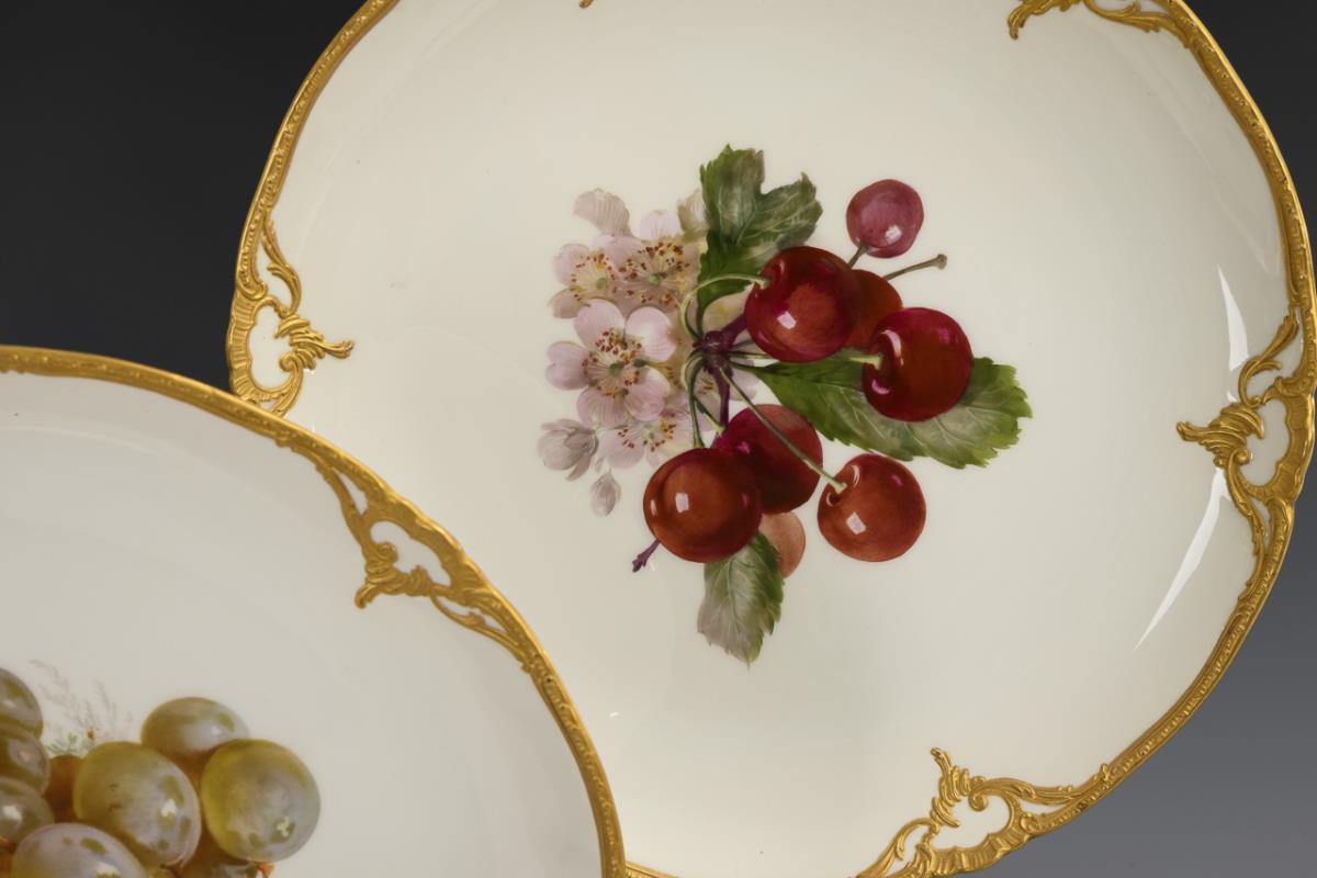 Plate with gold-bronzed rocaille relief on the rim, each with a finely painted fruit bouquet. 1x with rim restoration.