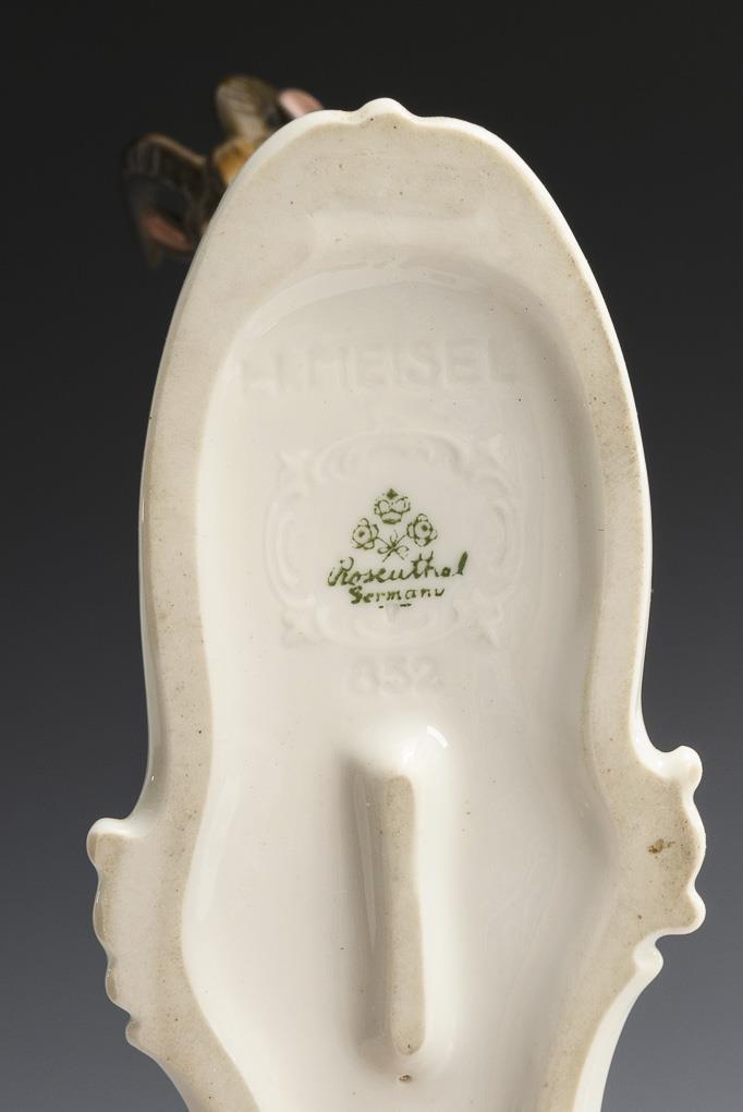 1x ROSENTHAL, model no. 852, design around 1925 by Hugo Meisel (1887-1966): cherub riding on a leaping billy goat (h 21 cm). / 1x GOEBEL, model no. 132, design by Gustafson: faun boy fighting with a billy goat (h 12 cm).