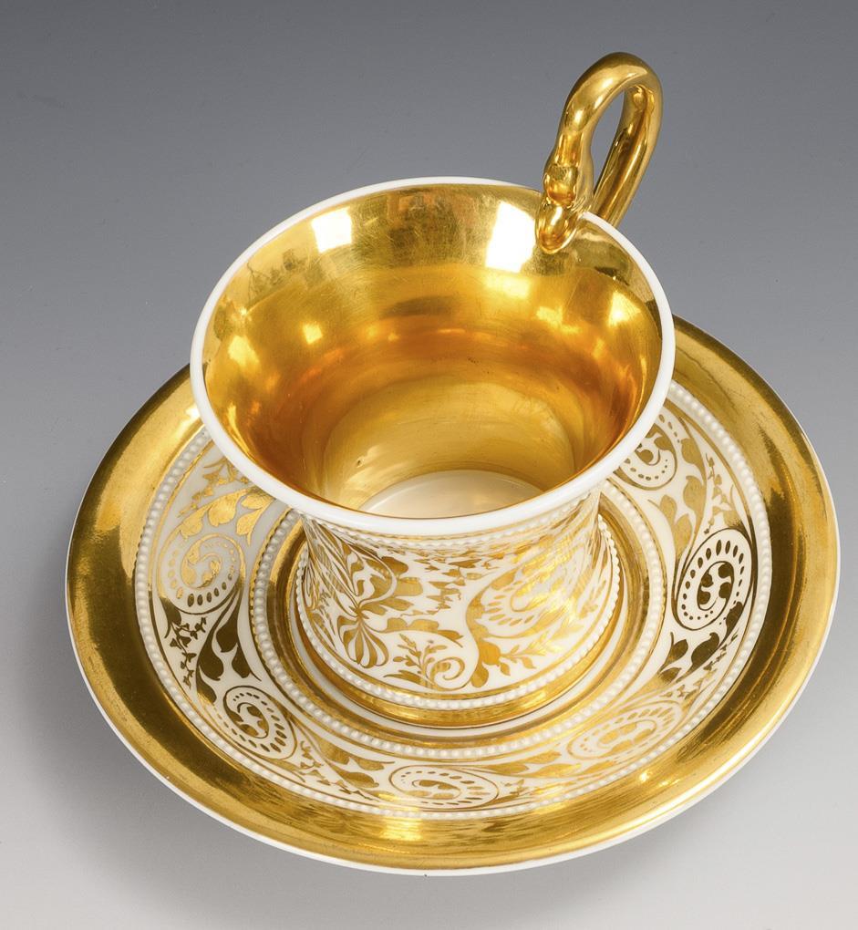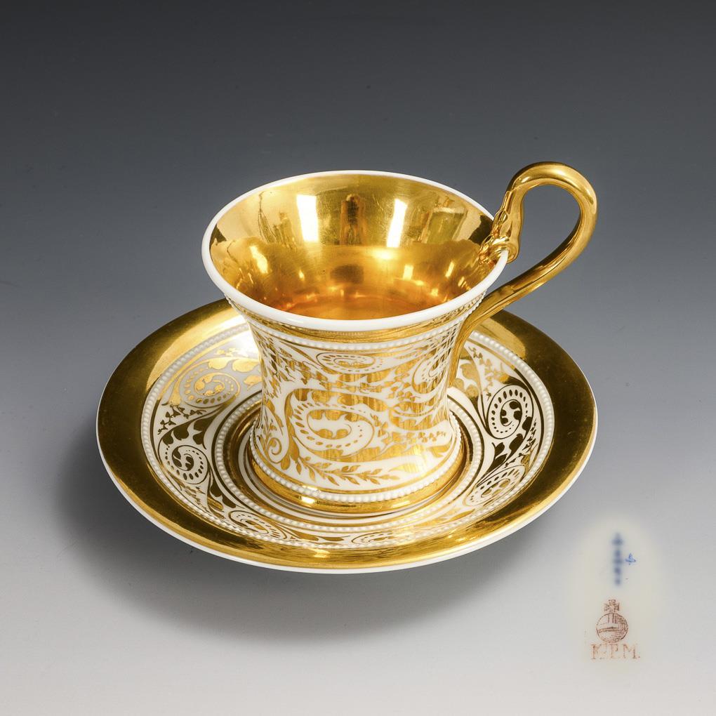Gold-decorated. Cup (h 10.5 cm), original saucer (Ø 15.5 cm).