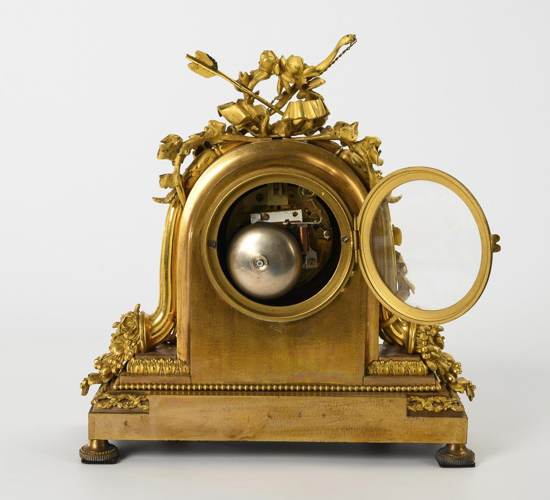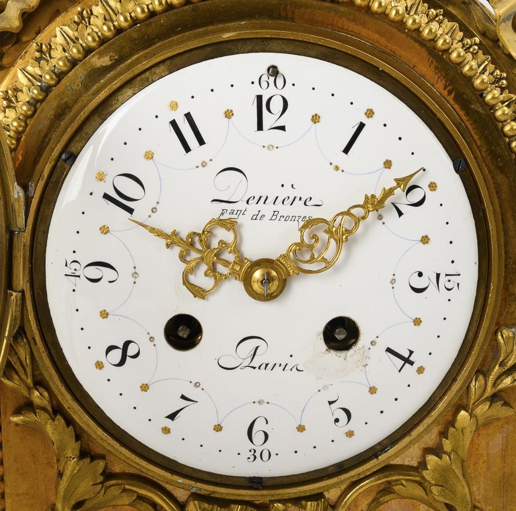 Marked "JX Denière a Paris", with additional stamp "Médaille d`Or Paris 1827", half-hour strike on bell, additional screwed-on, supplemented quartz movement. Clock not in working order. White enamel dial marked "Denière, F[abric]ant de Bronzes, A Paris" with Arabic numerals, minute ring and Louis XV hands.