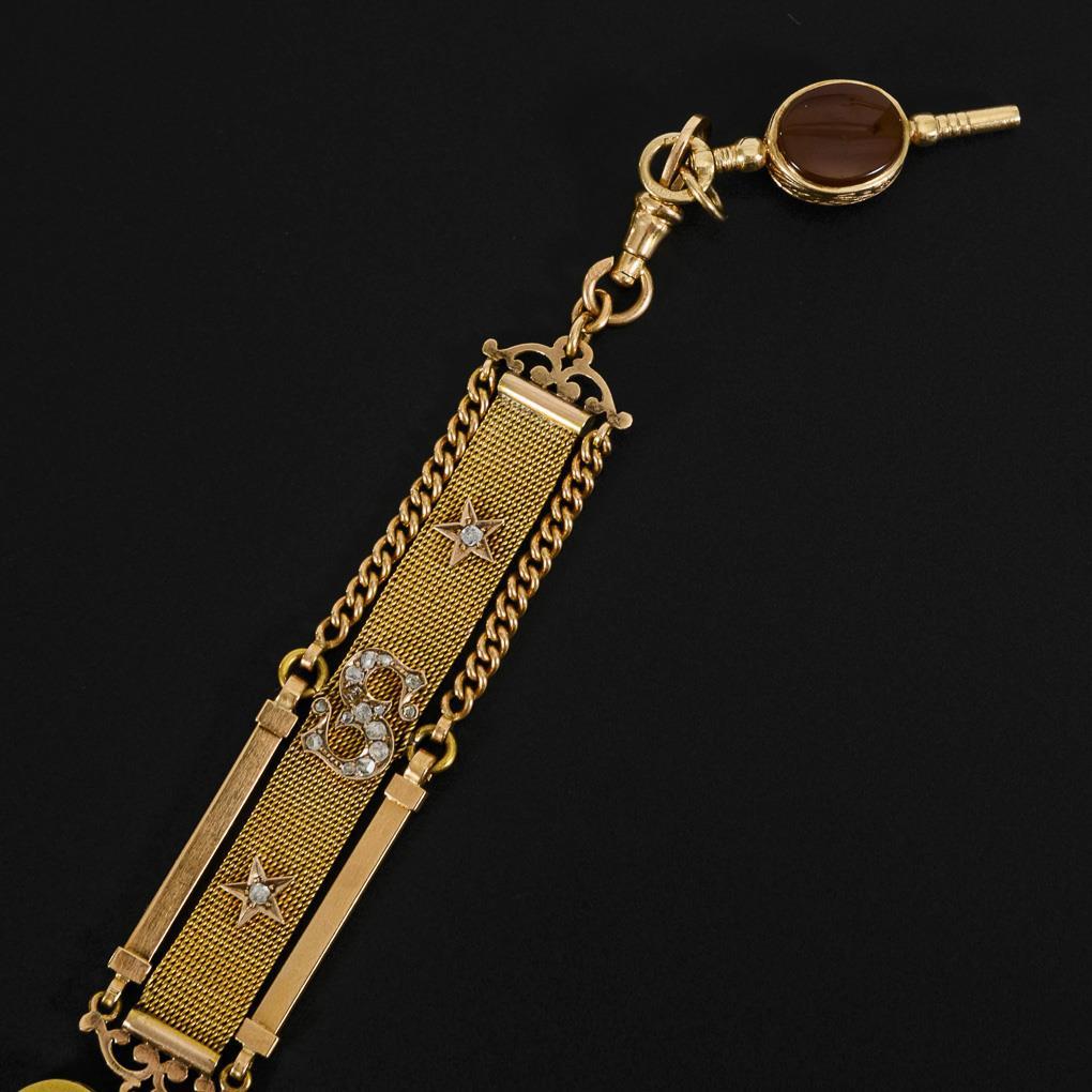 Checked rose gold 750. Watch key stamped yellow gold 375. Châtelaine 12.5 x 1.8 cm. Watch key 3.5 x 1.1 cm. 16,9/3,8 g.