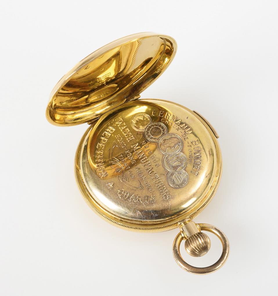 Marked movement with Swiss lever escapement, screw compensation balance, jewels, crown winding, repeater with lateral release. Functional in short-term test. "Fernand Bonnet, Hongkong, Shanghai & Tientsin" marked, white enamel dial with Roman numerals, minute ring, small second and Louis XV hands.