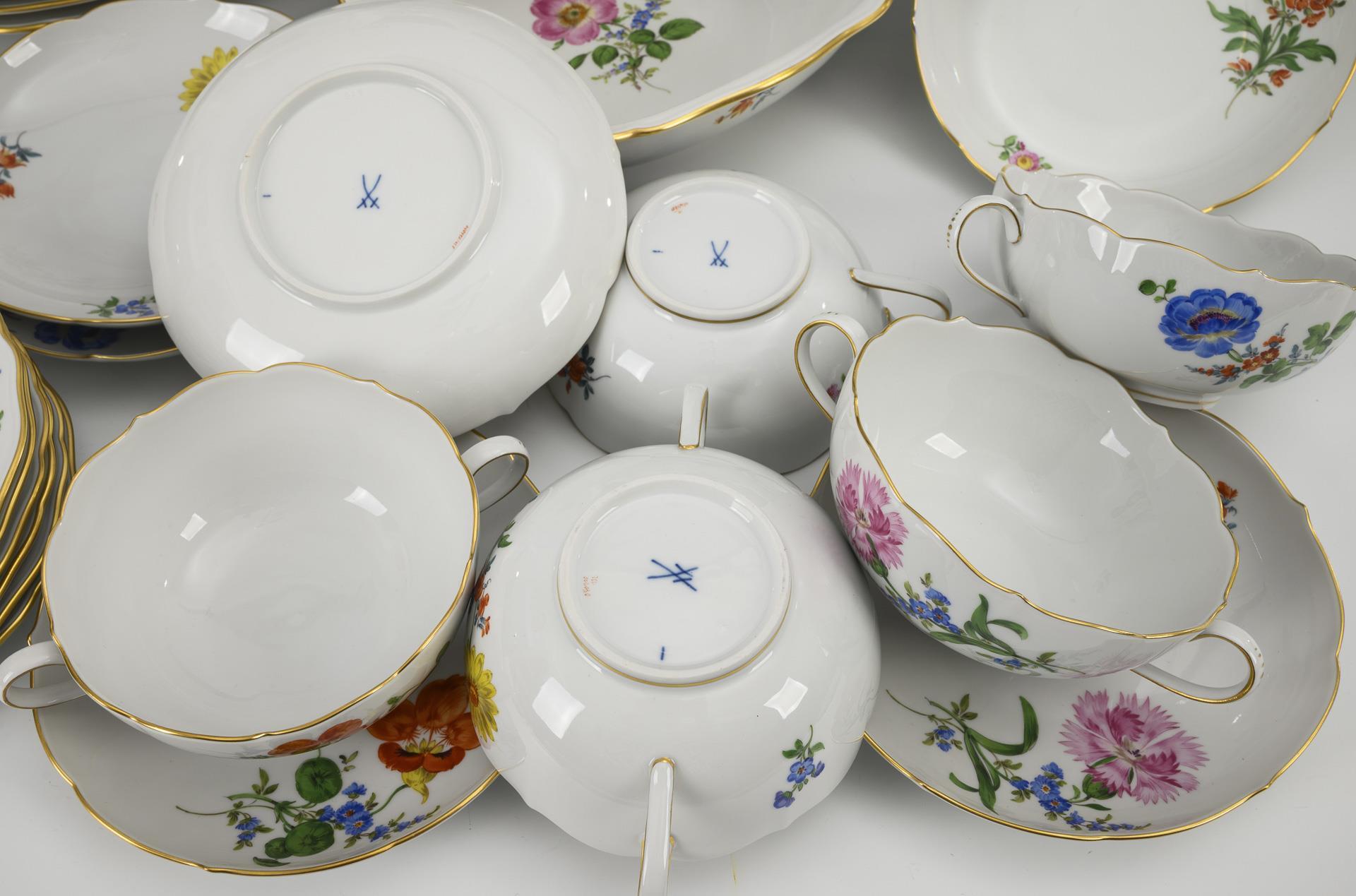 28 parts. "New cut-out" shape. 6 dinner plates, 6 soup cups, 6 saucers, 6 bread plates, serving platter (L 35.5 x 26 cm), lidded bowl (⌀ 26 cm), square bowl (⌀ 22.5 cm), sauce boat (L 18 cm, W 9 cm). Hairline crack in the handle of a soup cup.