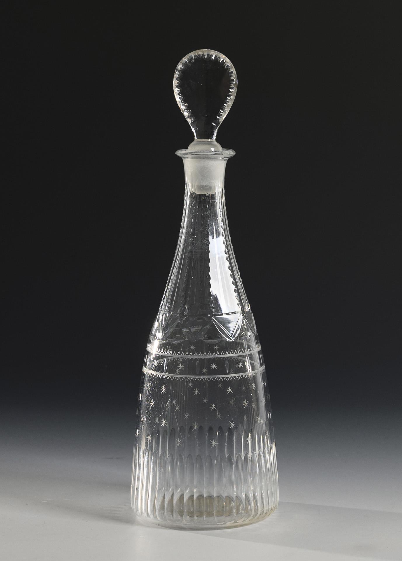 Narrow-necked decanter with faceted neck, notch and star cut and original stopper (h 29.5 cm). / 6 glasses with half-ovoid bowl merging into the faceted stem, star cut and a pinflower border (h approx. 11.5 cm).