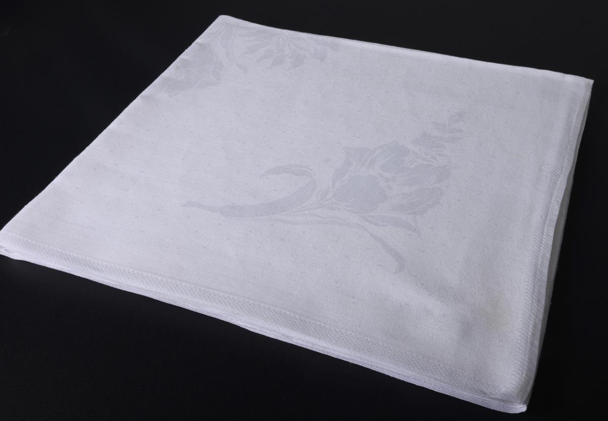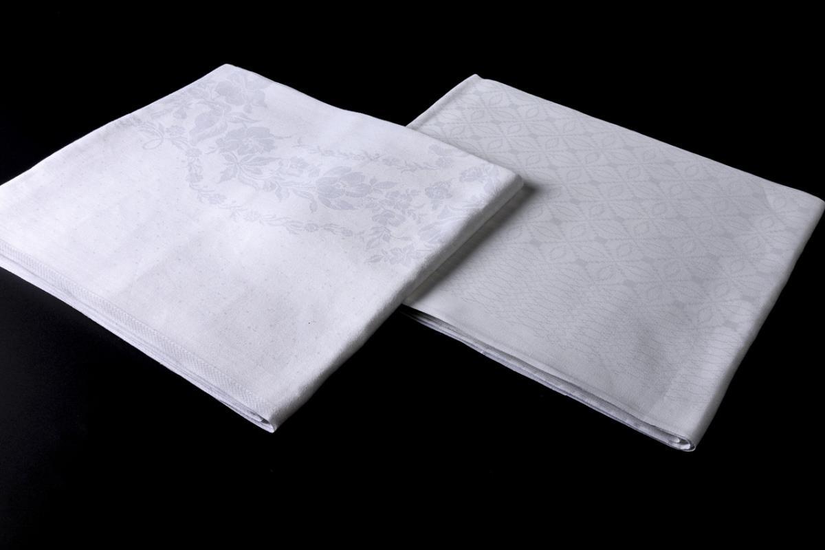 Cloth with decorations of curved flower garlands and blossoms, large tulips in the corners / Table cloth with small geometric pattern.