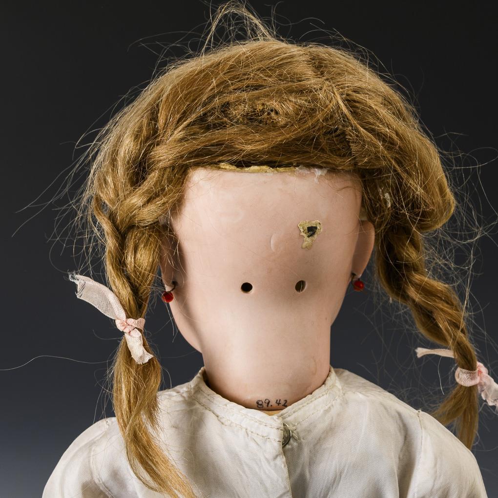 Blonde doll girl Cuno & Otto Dressel (marked "C", stamp number 89.42) with brown sleeping eyes, earrings, mohair wig with pigtails and 17-part jointed body. 1 tiny chip on the right earlobe, body painted over. L 46 cm. / Smaller doll girl (marked "1000", unknown maker) with fixed blue eyes, brown mohair wig and 9-part jointed body. Minimal wig sweater. L 41 cm. Heads x-rayed: without cracks.