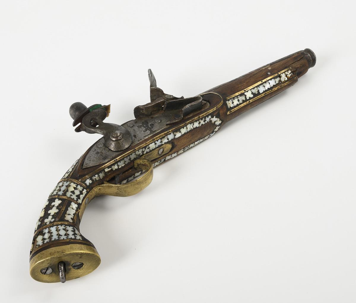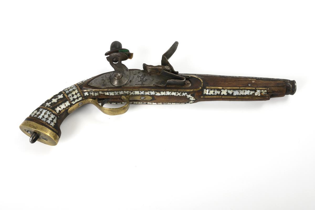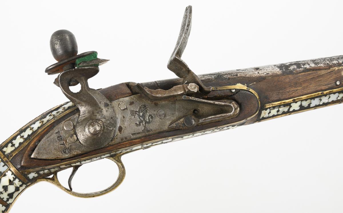 Probably a replica with marks and numbers on the lock plate and cross-shaped mother-of-pearl inlays in brass strip mounts. Without ramrod, minor dry cracks, defects on the inlays, signs of age/use.