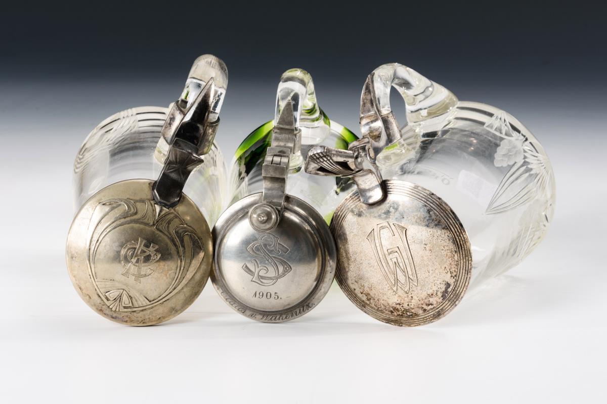 2x farbloses Glas, 1x farbloses Glas mit grüner Tropfeneinschmelzung, alle mit Metall- bzw. Zinndeckel. 2x mit Schliffdekor.