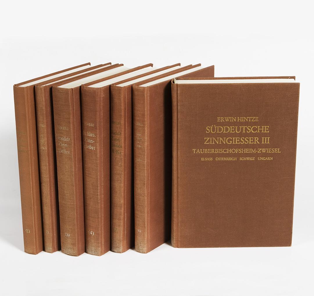 Volume I: Saxon pewterers, 1531 illustrations, 345 pages. Volume II: Nuremberg pewterers, 341 illustrations, 175 pages. Volume III: North German pewterers, 1652 illustrations, 544 pages. Volume IV: Silesian pewterers, 1164 illustrations, 452 pages. Volume V: South German pewterers, 803 illustrations, 339 pages. Volume VI: South German pewterers, 786 illustrations, 320 pages. Volume VII: South German pewterers with appendix Alsace, Austria, Switzerland, Hungary, 1693 illustrations, 507 pages. Cloth with gold embossing. Spine faded, overall good condition.