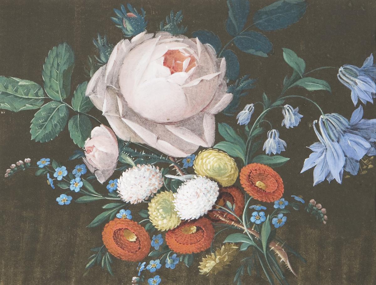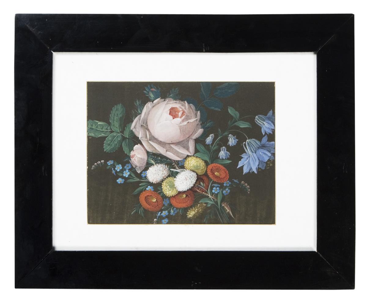 The individual blossoms stand out against the dark background with strength and contrast, they are placed in a well-considered composition in the picture plane, an arrangement executed like an oil painting. Passepartout, glazed blackened Biedermeier frame with original wooden back panel. Mounted with adhesive tape at the corners.