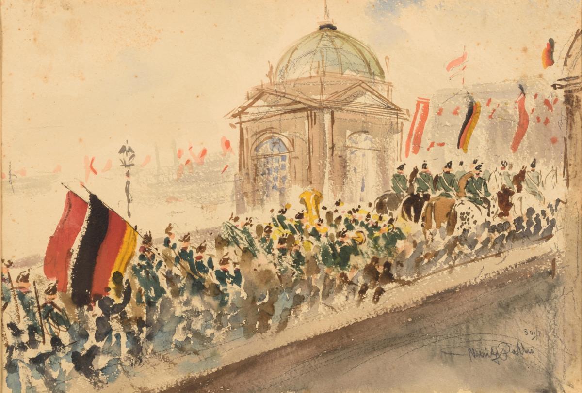 Pathé, Moritz: Aufzug Berliner Polizei. Aquarell, re. u. Bleistift-