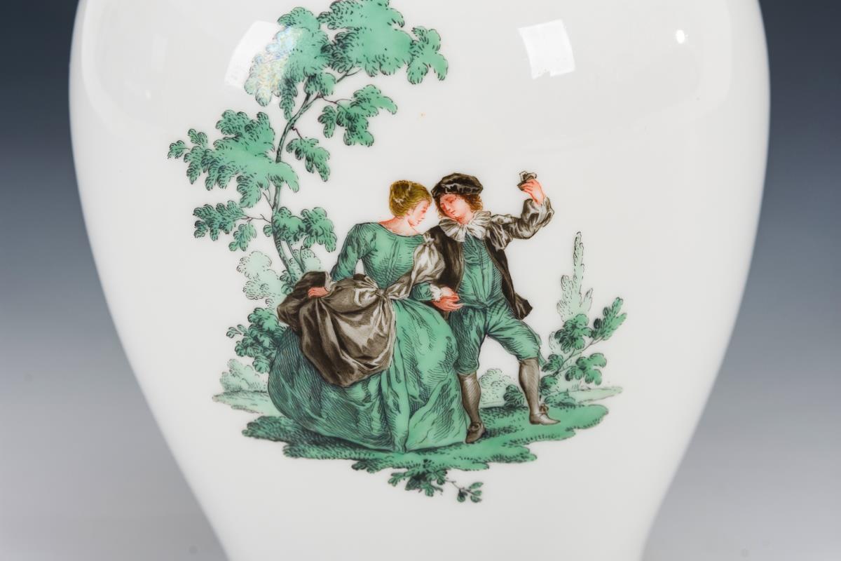 Deckelvase mit kupfergrüner Watteaumalerei.