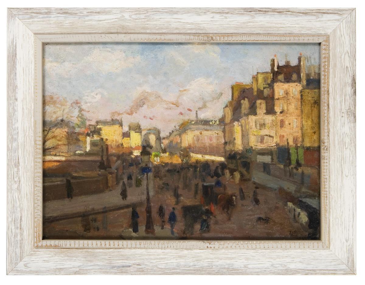 Bridge over the Seine with rich figural staffage and horse-drawn carriages. View with a pronounced dark zone in the foreground and bright house fronts in the sunlight. Indistinctly signed, inscribed. Mint frame.