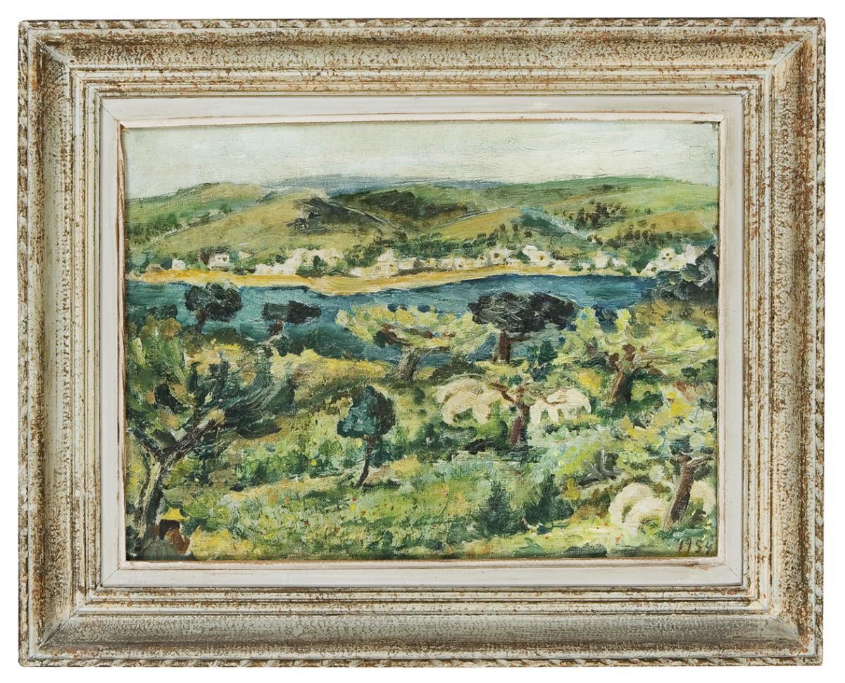Predominantly in shades of blue and green, which give the landscape the character of freshness and pulsating life, executed in loose, impasto brushstrokes. Gray profile frame. A central patch on the reverse.