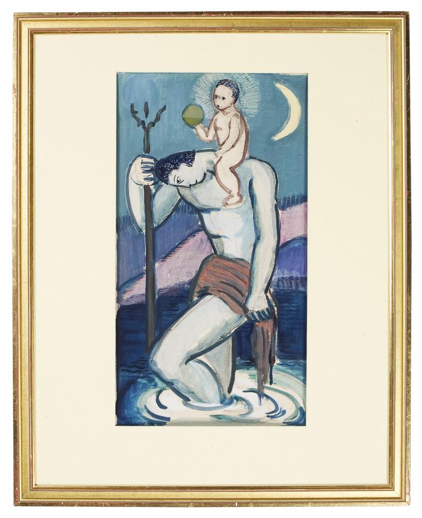 Christophorus, the bearer of Christ, one of the fourteen holy helpers, patron saint of travelers and pilgrims, commemorated on 24 July. Passepartout, glazed profiled gold frame. Mounted with adhesive tape.
