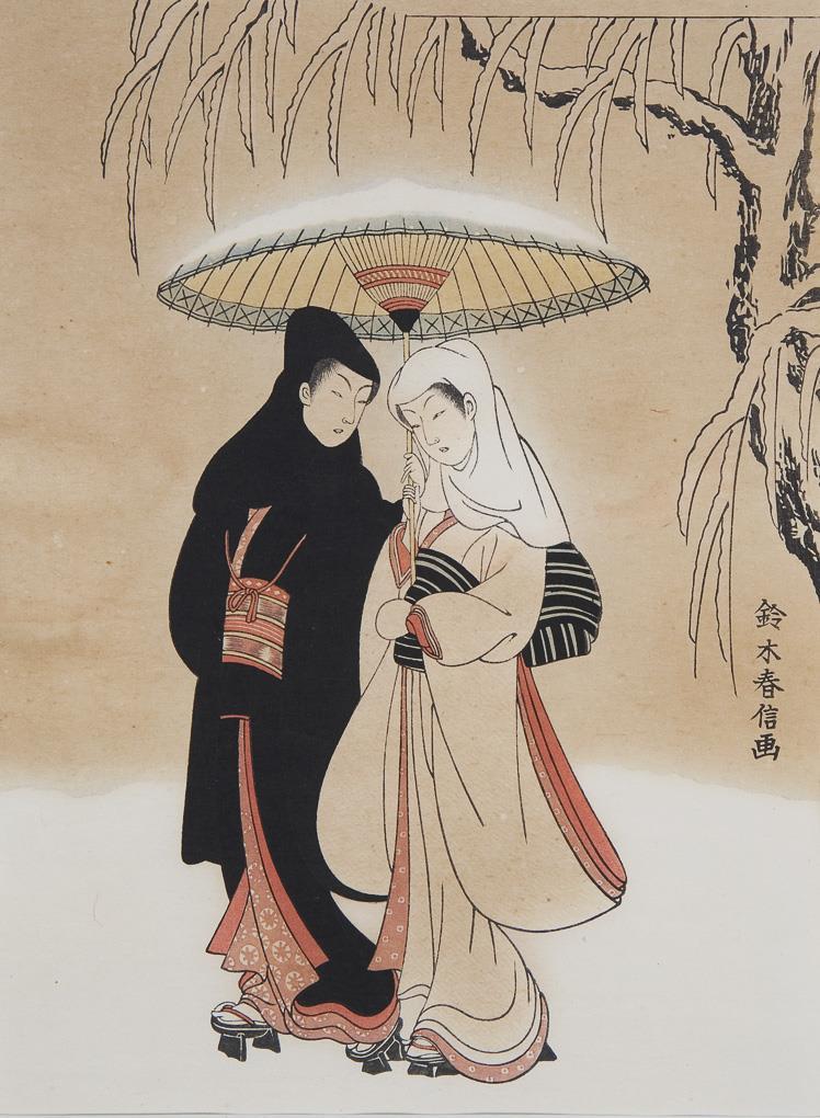 Reprint after Suzuki Harunobu (1725-1770 Edo). Signed on the side, small stamp on the reverse. Glazed removable frame in mint condition. Mounted in the upper margin.
