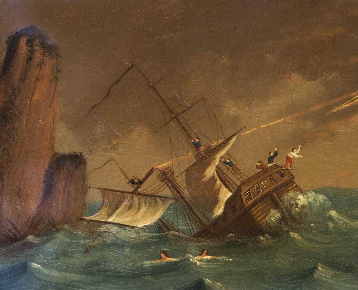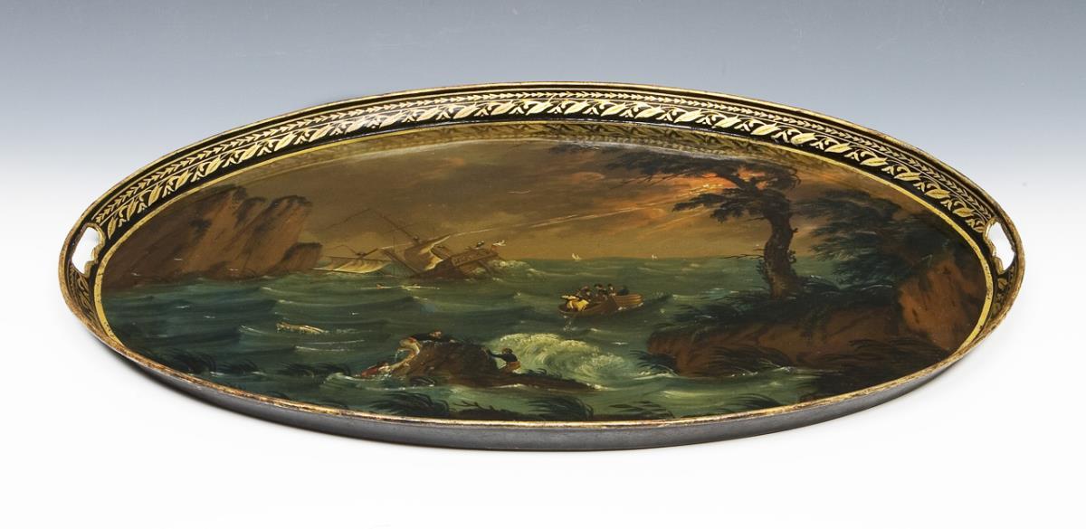 Braunschweig or Berlin, attributed to the Stobwasser manufactory. Large color painting "Schiffbruch vor felsiger Küste" in the mirror, floral gold border on the flag. Oval shape with recessed handles on the sides.