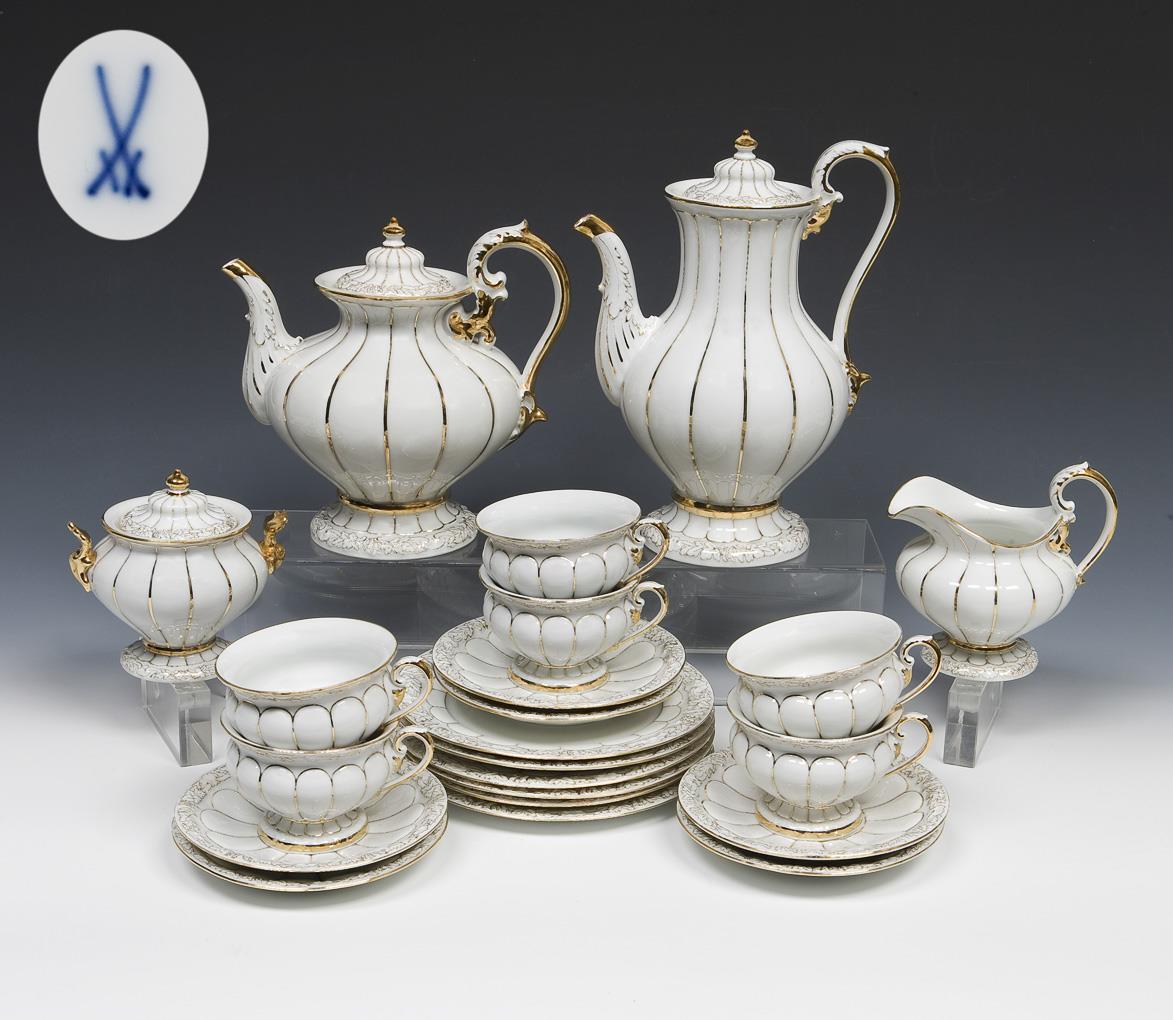 22 pieces: Teapot, coffee pot, sugar bowl, milk jug, set of 6 cups, set of 6 saucers, set of 6 dessert plates. "X-shape", relief, gold painted. Painter's marks, press marks, sword marks, sugar bowl, teapot painted twice.