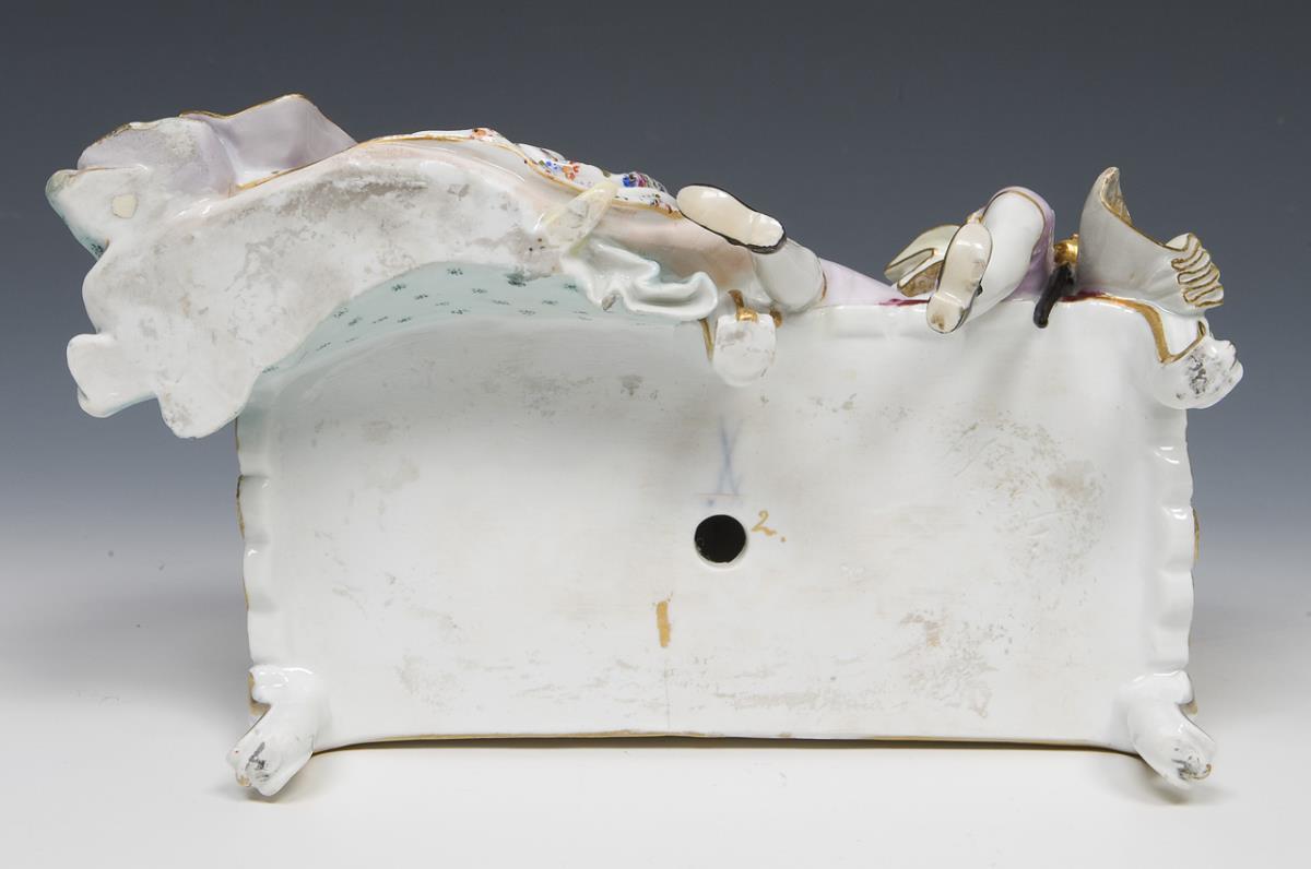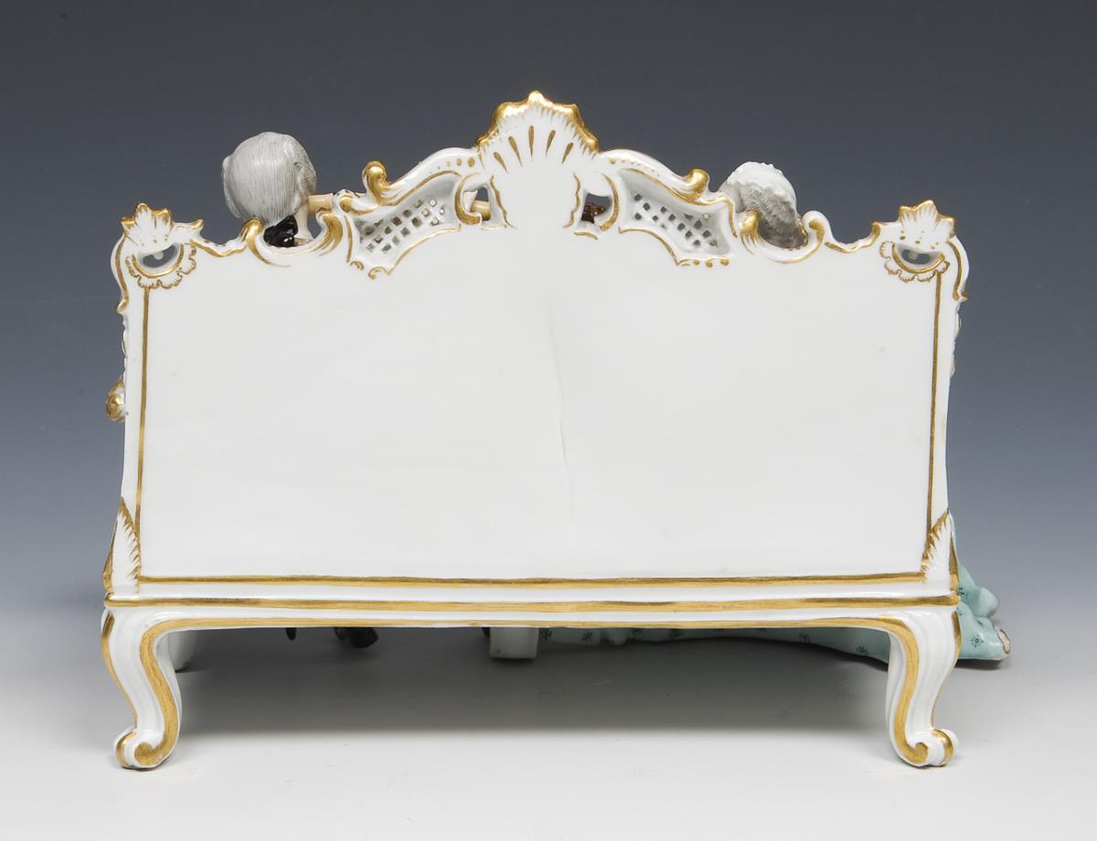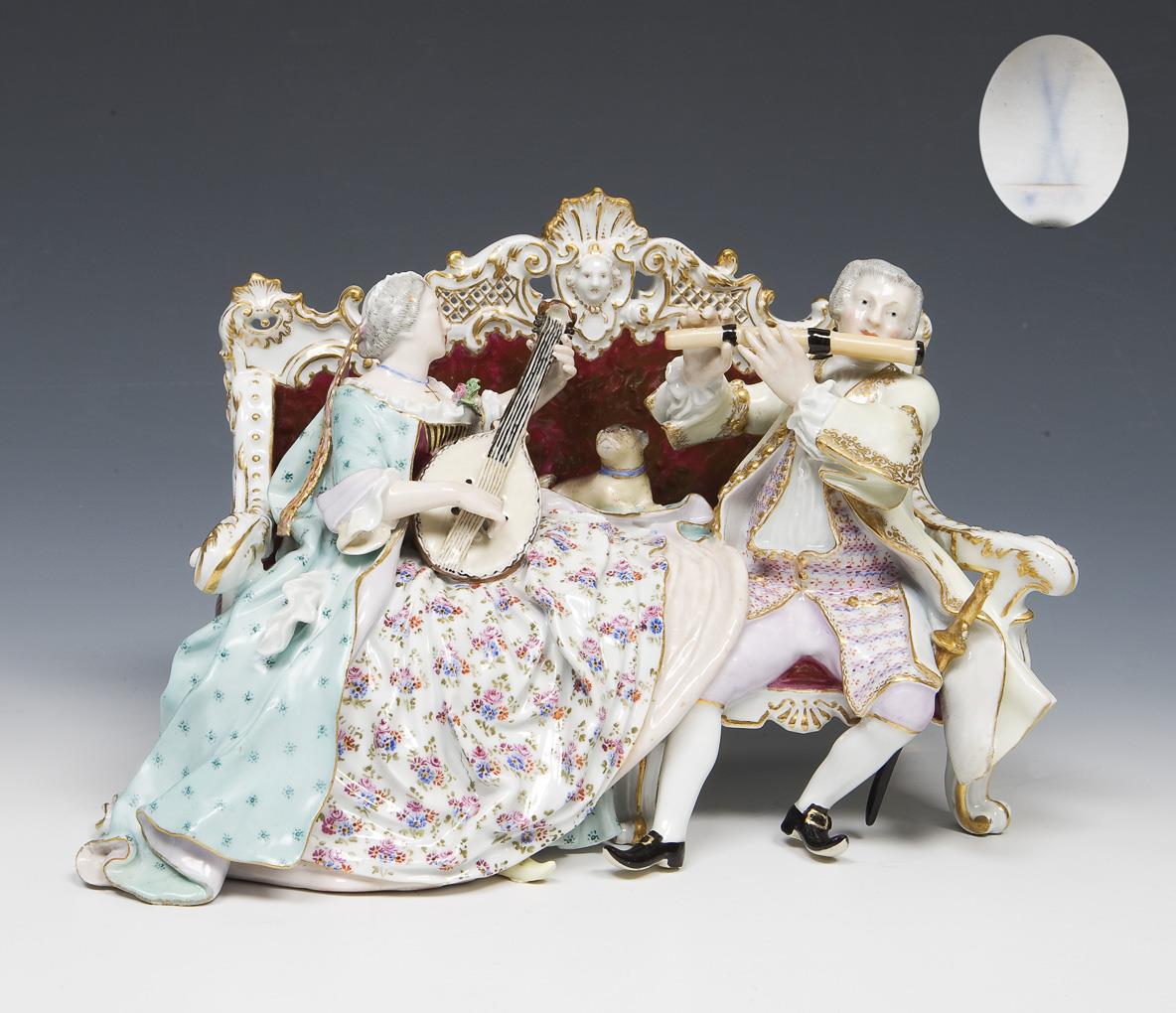 Kaendler 1737: "Zwey stark verzierte Cannabee, wort auf zwey Figüren sietzen in der Massa Corrigiret, solche sind sehr mühsam, weiln beide Figüren Musicalische Instrumenta in Händen haben und darauf gleichsam als Natürlich gespielt". Meissen manufactory price: 13,000 euros * Partner auction Bergmann.