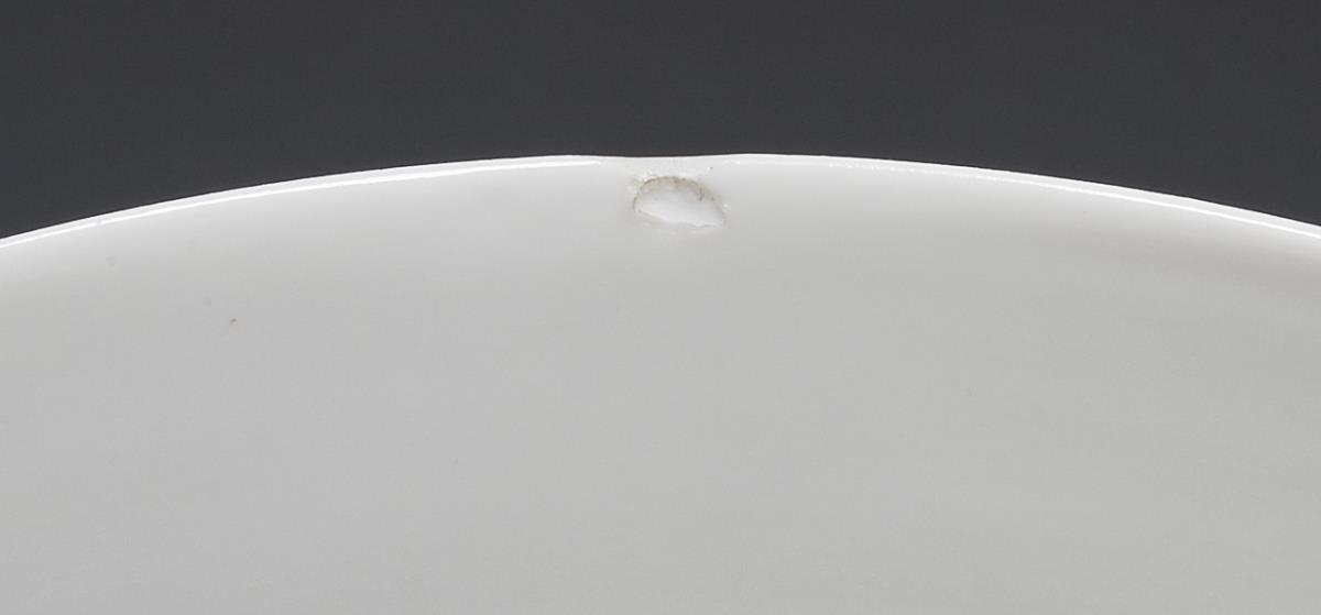 Model year: 1903. Relief decoration "whip lash", cobalt blue underglaze painting. Press marks, painter's marks, artist's signet, sword marks painted twice. Rim slightly bumped from below.