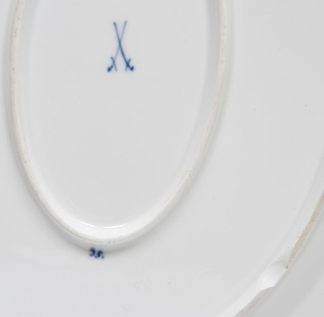 Model year: 1901. 4 pieces: 1 plate, 1 pair of egg cups, 1 salt cellar. Celadon green and cobalt blue underglaze painting, "Flügelmuster", shape "T glatt". Press marks, painter's marks, sword marks. Standing ring of the plate chipped.
