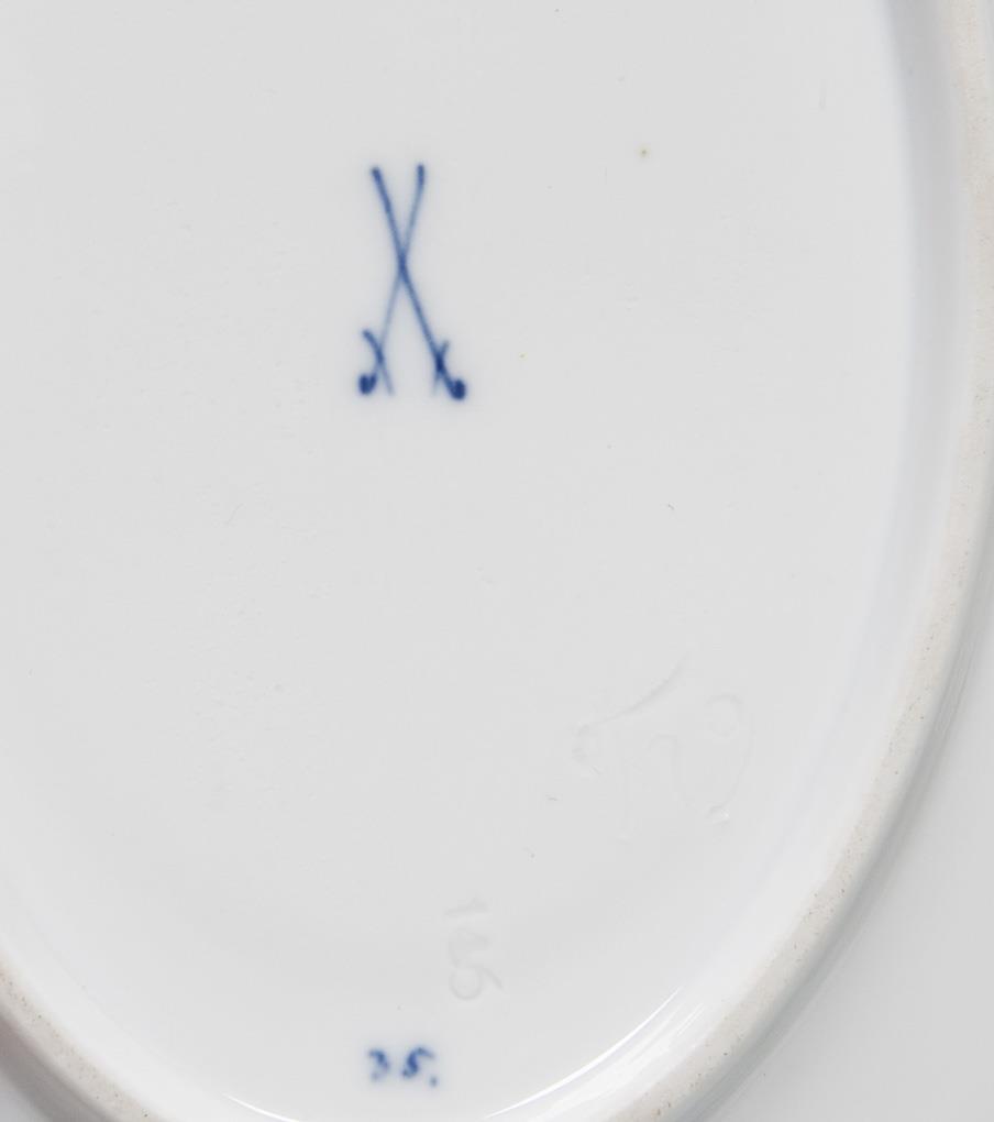 Model year: 1901. 22 pieces: 1 large serving plate, 1 bowl, 1 sauce boat with saucer, set of 6 dinner plates, set of 6 soup plates, set of 6 dessert plates. Celadon green and cobalt blue underglaze painting, "Flügelmuster", shape "T glatt". Press marks, painter's marks, sword marks.