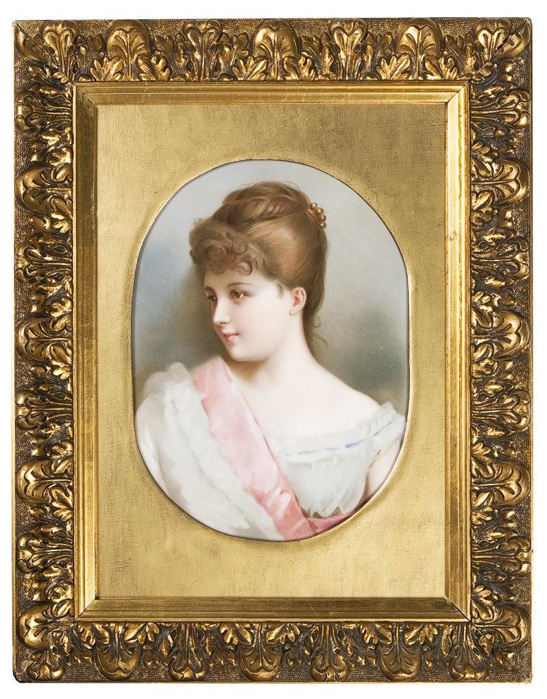 The graceful young, pretty figure presents herself with slightly smiling facial features in three-quarter profile. Finely painted in pastel colors. Unsigned, octagonal shape, unglazed base, without mark. Gilt stucco frame with gilded wooden passe-partout. Mounted on the wooden passe-partout.
